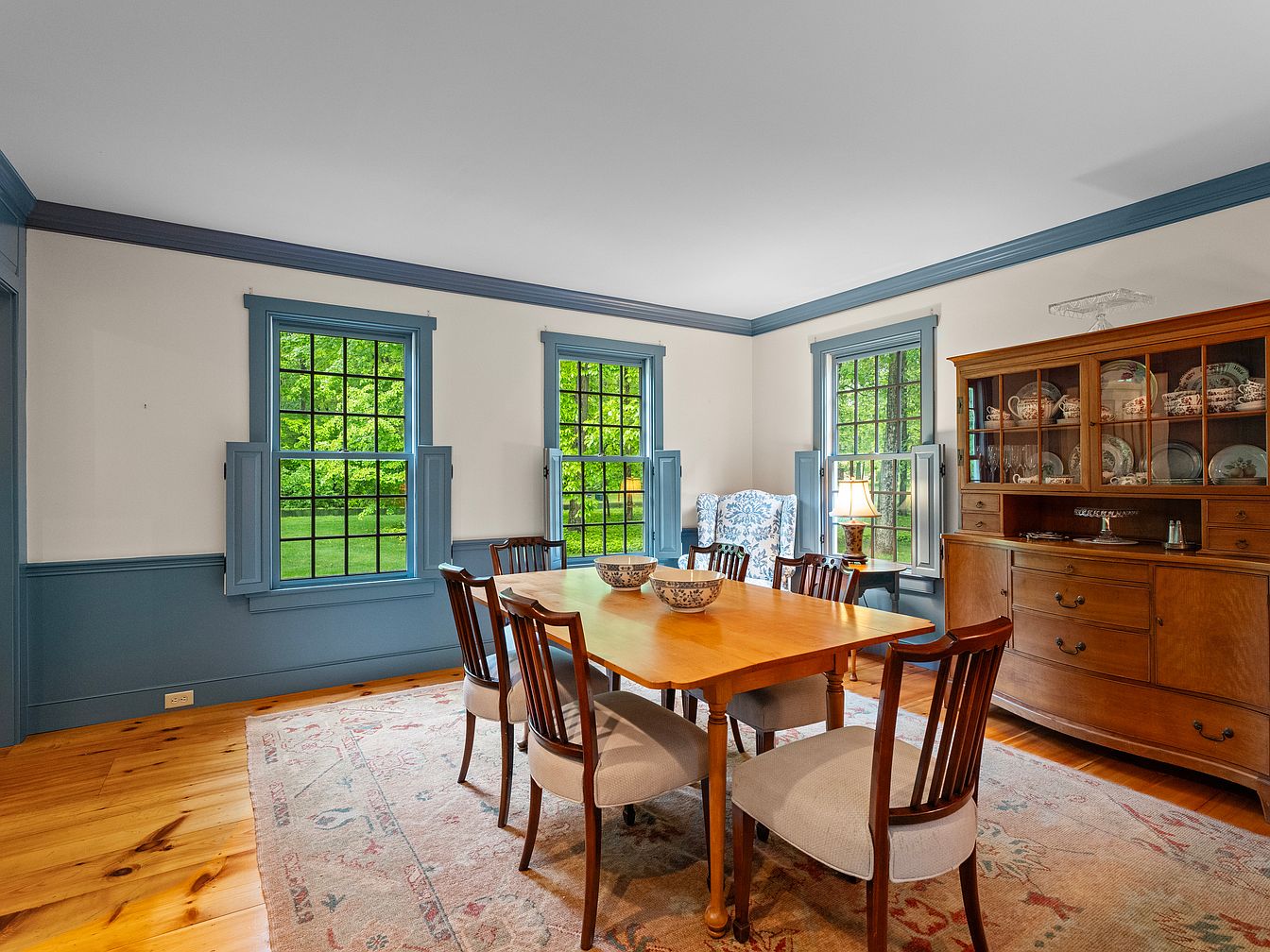 A bright dining room features a large wooden table surrounded by elegant chairs with upholstered seats. Light shines through multiple large windows framed in soft blue paint, enhancing the room’s airy feel. The walls blend a creamy tone with matching blue trim, emphasizing architectural details. A vintage china cabinet in rich wood showcases delicate dishware, while a patterned rug adds warmth underfoot. A cozy armchair upholstered in a floral fabric is tucked in a corner, inviting relaxation. Overall, the space exudes historic charm with a comfortable ambiance, perfect for gatherings or quiet meals.