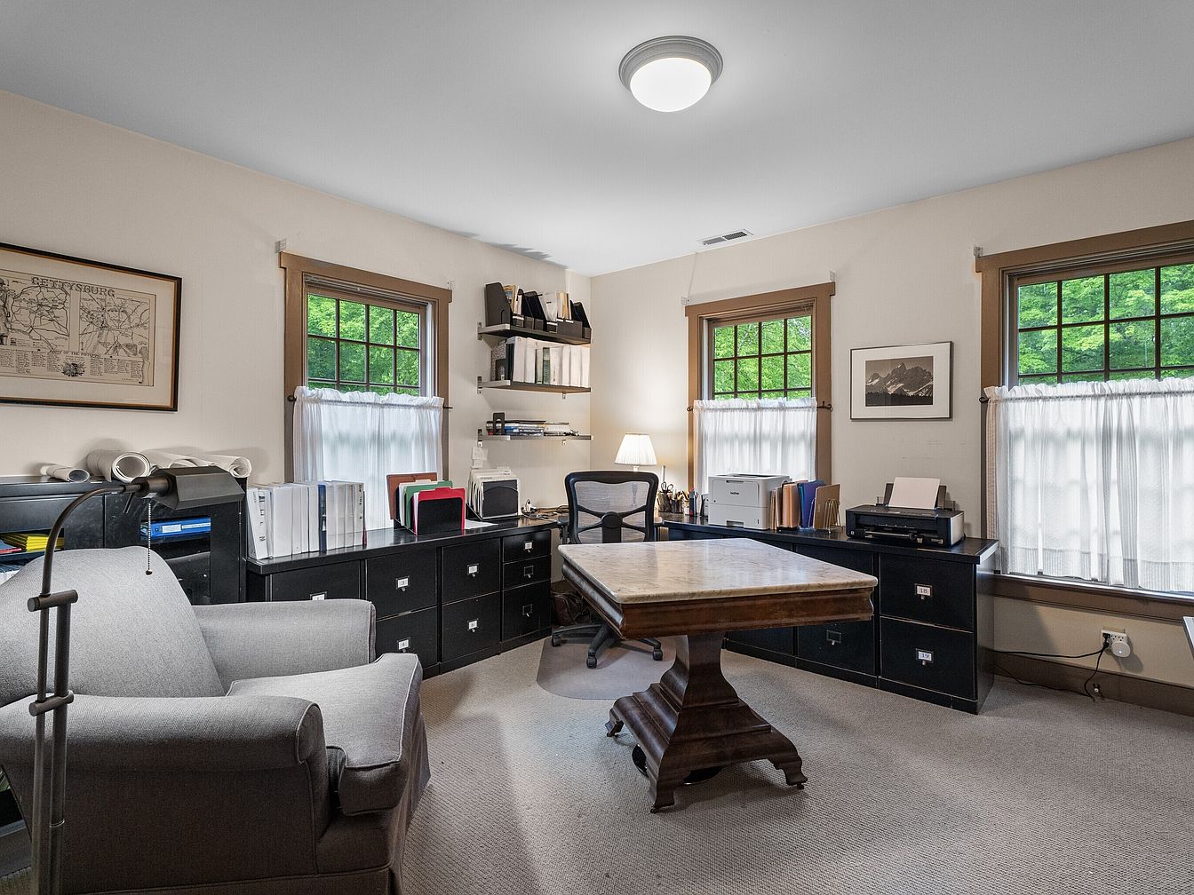 This home office features a practical layout with a central wooden desk and comfortable chair, complemented by a cozy gray armchair in the corner. The walls are painted in a soft cream, harmonizing with the natural wood trim around the windows. Built-in shelves display books and office supplies, while filing cabinets provide efficient storage. Abundant natural light filters through the double-hung windows adorned with sheer white curtains, enhancing the room’s inviting atmosphere. A subtle area rug adds warmth to the carpeted floor, and a modern ceiling light offers adequate illumination for work.
