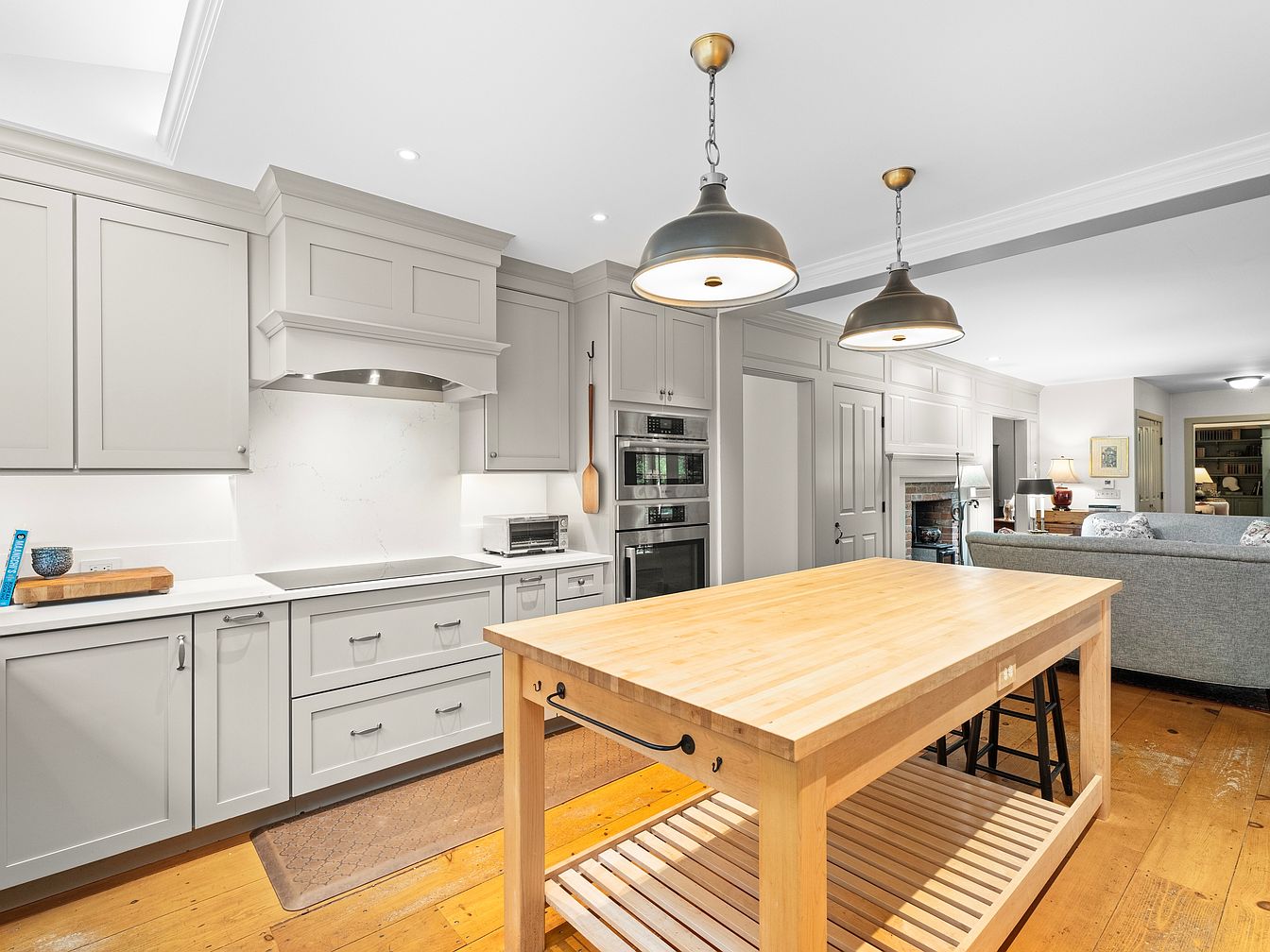 The kitchen features a light gray color scheme with elegant cabinetry and a spacious layout. The cabinets are complemented by polished white countertops that reflect light, enhancing the airy feel. A central butcher block island provides additional workspace and seating, with a warm wood finish. Pendant lights hang above, adding a touch of character and illumination. Modern appliances, including a built-in oven and sleek cooktop, are integrated into the cabinetry. The floor showcases wide wooden planks, contributing to a cozy ambiance. An open view of the adjacent living area creates an inviting atmosphere, perfect for family gatherings.