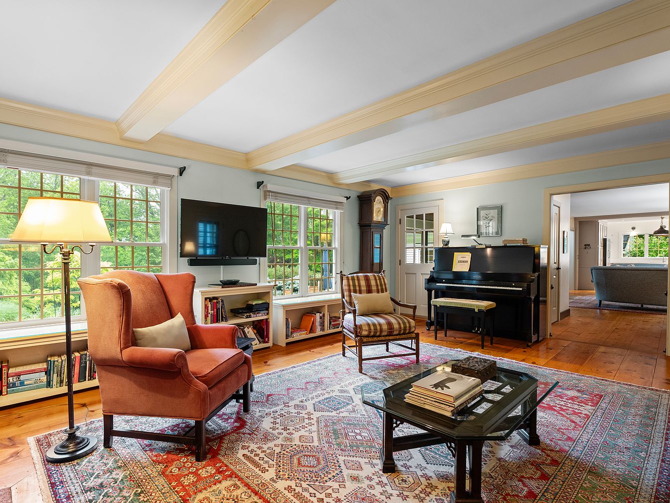 This living room features a warm and inviting layout with rich wooden flooring. Large, multi-pane windows allow natural light to fill the space, enhancing the soft blue walls and light-colored ceiling beams. A classic upholstered orange wingback chair and a decorative striped chair provide seating, while a black grand piano adds elegance. The area rug shows intricate patterns with reds, creams, and blues, grounding the space. A sleek glass coffee table displays books, creating a casual yet refined atmosphere. Additional elements include a standing lamp for subtle lighting and a charming grandfather clock, adding a nostalgic touch.