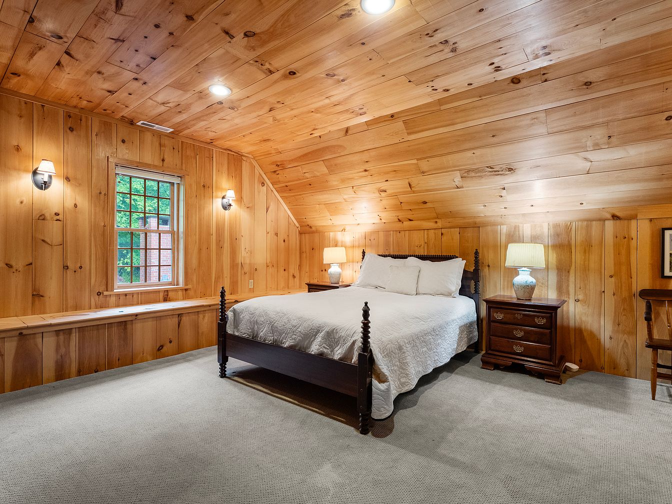 This cozy bedroom features warm wood paneling throughout, creating an inviting atmosphere. The sloped ceiling enhances its charm, and recessed lighting brightens the space without overpowering it. A plush carpet adds comfort underfoot. Centrally positioned is a classic wooden bed with intricately turned posts, dressed in white linens. Flanking the bed are two elegant nightstands, one adorned with a lamp that casts a soft glow, while the other showcases a decorative vase. A small writing desk and chair are positioned beside a window, which frames views of the lush outdoor greenery, adding to the serene ambiance.