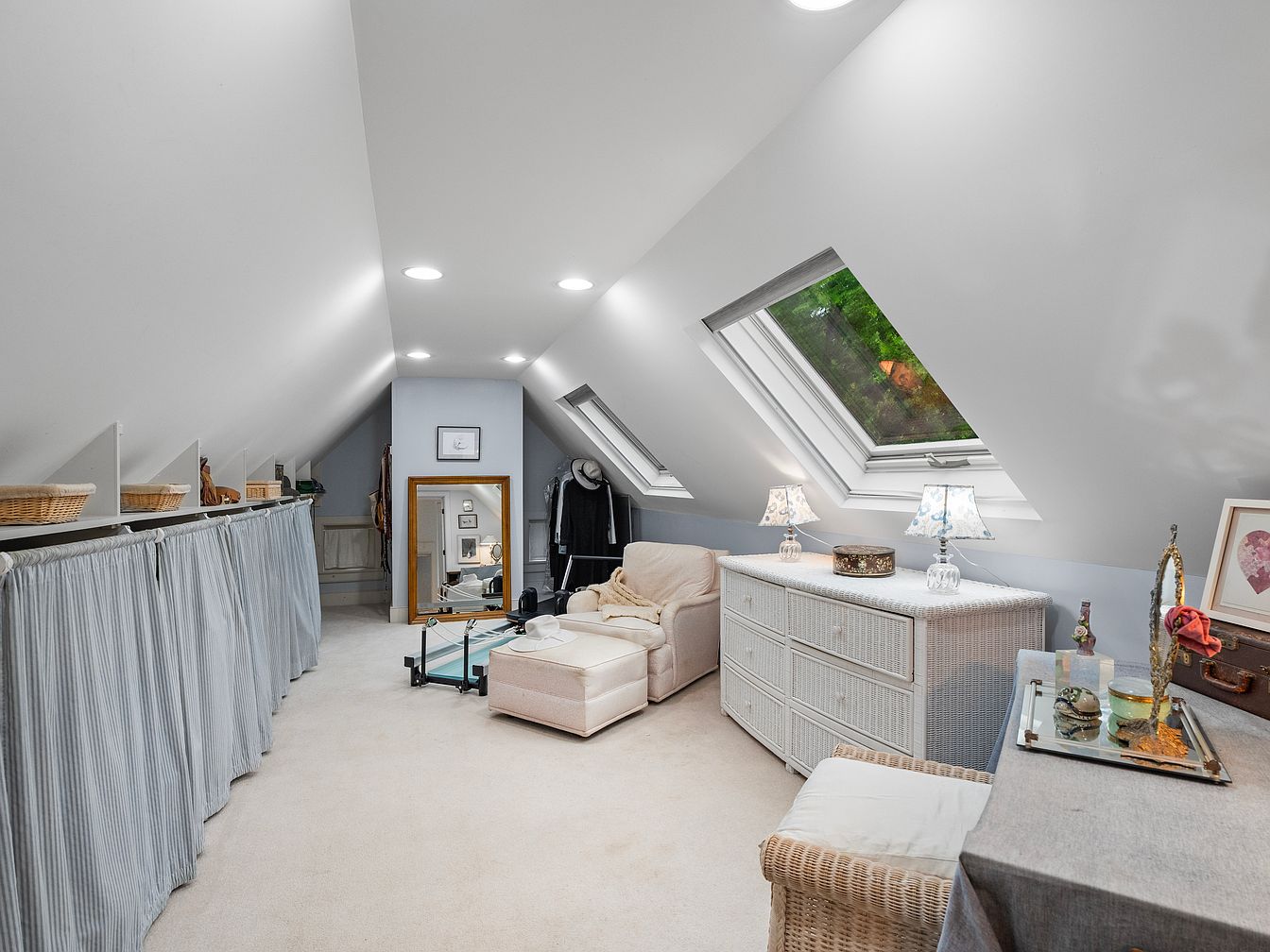 A cozy attic space with sloped ceilings, enhanced by soft gray and white tones. Natural light filters through two skylights, illuminating the plush beige carpet and inviting cream-colored sofa. A white wicker dresser, adorned with decorative items and vintage lamps, adds charm. A mirrored stand reflects the tranquil atmosphere, while light blue curtains with a subtle stripe pattern conceal storage baskets above. An adjacent small table showcases personal artifacts, enhancing the room’s intimate feel. The layout promotes a relaxed ambiance, ideal for a personal retreat or creative workspace, blending functionality with aesthetic warmth.