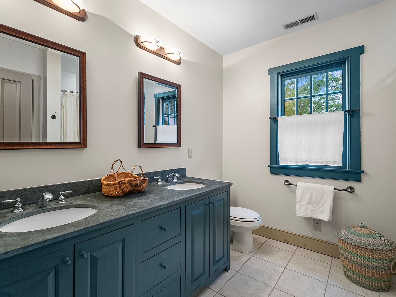 A well-designed bathroom featuring a double vanity with a dark gray stone countertop and two inset porcelain sinks. Beneath the countertop are rich blue cabinetry providing ample storage, complemented by dark wooden adornments on the mirrors. The walls are painted in a soft beige, lending warmth to the space, while the intricate blue framing of the window contrasts beautifully with the lighter tones. Natural light filters through the window, showcasing a view of greenery outside. Decorative elements include a woven basket atop the counter and a colorful laundry hamper in the corner, enhancing the room’s inviting atmosphere.