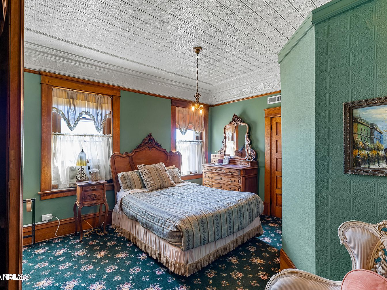 This vintage bedroom features a harmonious blend of historical charm and elegant design. The walls are painted a soothing green, complementing the intricate white ornamental ceiling. A large, ornate wooden mirror reflects the stylish decor, showcasing a beautifully carved wooden bed adorned with a striped comforter. Decorative pillows add a touch of luxury. The floor is carpeted in a floral pattern, enhancing the warm atmosphere. Natural light streams through sheer curtains on two windows, illuminating the room. An inviting armchair peeks through an open door, and the polished wooden trim and detailing exhibit classic architectural finesse.