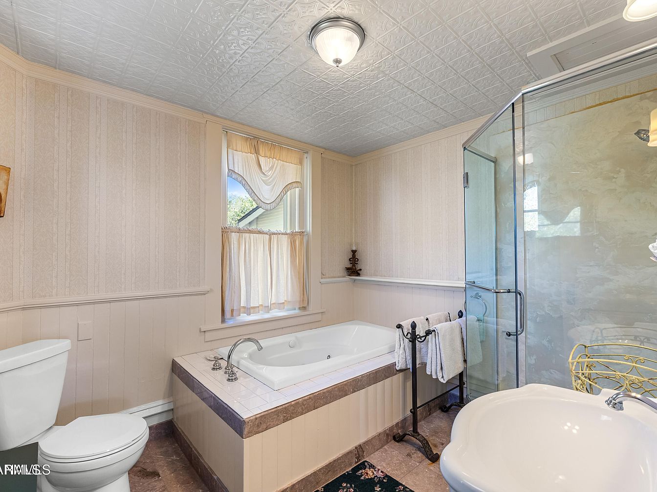 This historic bathroom features a blend of vintage and modern elements. The layout includes a luxurious jetted tub, framed in a polished marble edge, and a spacious glass shower with a sleek door. A classic white toilet complements the space. The walls are adorned with soft, pale wallpaper that showcases subtle patterns, harmonizing with the warm beige tones of the wainscoting. Natural light streams in through a window dressed with sheer drapery. A decorative rug adds a touch of comfort, while a graceful metallic towel rack provides practical elegance. The intricate ceiling design enhances the room’s charm.