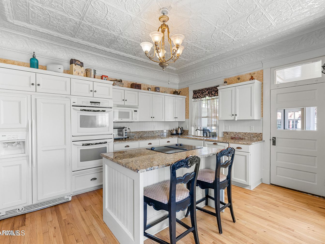 This kitchen features a classic layout with white cabinetry providing a clean and elegant appearance. The ceiling showcases intricate plasterwork, adding historic charm. A large granite countertop anchors the space, complemented by black and white bar stools that create a stylish contrast. Modern appliances, including dual ovens and microwave, blend seamlessly with the cabinetry. Natural light streams through windows dressed in patterned valances, enhancing the inviting atmosphere. The warm wooden floor contrasts beautifully with the bright white and cream tones of the cabinetry, creating a balanced and sophisticated culinary environment.