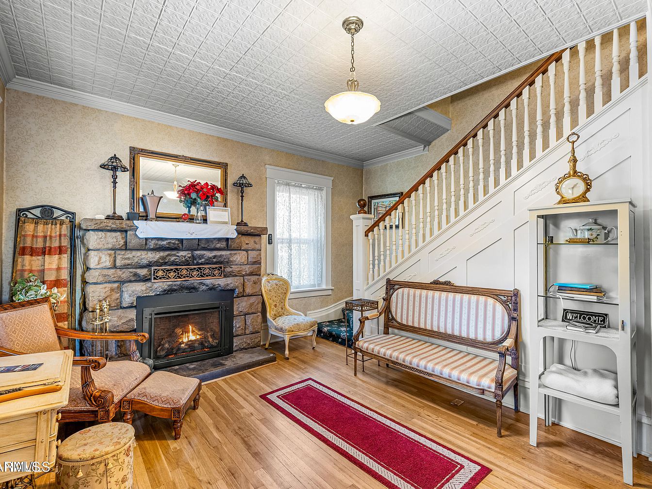 This cozy entryway features a charming combination of historic elements and modern comforts. The walls are adorned with subtle, off-white wallpaper, complementing the vintage-style ceiling tiles. A decorative stone fireplace serves as a focal point, framed by a wood mantel and highlighted with seasonal decorations. The seating includes an elegant yellow upholstered chair and an intricately carved wooden settee with a striped fabric, providing a touch of refinement. Natural light filters through lace curtains, enhancing the warm ambiance. Rich wooden flooring contrasts beautifully with a vibrant red runner, inviting guests into this inviting space.