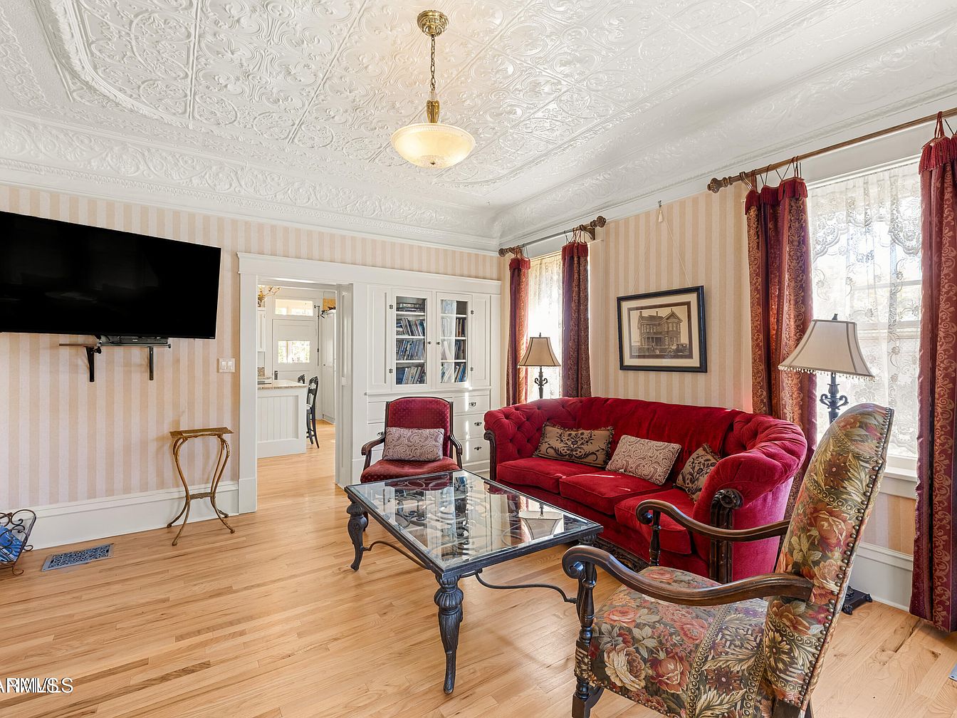 A cozy living room features a rich red tufted couch adorned with decorative pillows, complemented by an elegantly designed chair showcasing a vibrant floral pattern. The space is illuminated by natural light streaming through window treatments adorned with lace and plush burgundy drapes. A stylish glass coffee table with intricate detailing occupies the center, enhancing the room’s charm. Striped wallpaper in soft beige tones adds a touch of classic elegance, while the ornate ceiling with intricate plasterwork draws the eye upward. A mounted flat-screen TV merges modernity with the historic atmosphere, bridging the old and new seamlessly.