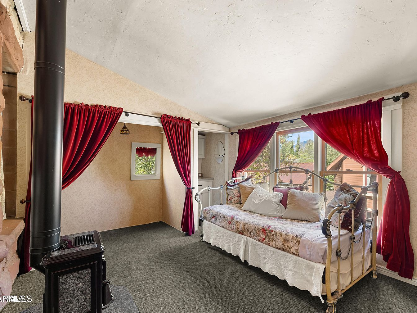 This cozy bedroom features a charming daybed adorned with floral bedding and an array of plush pillows. The color scheme blends soft neutrals with deep red accents from the floor-to-ceiling drapes framing large windows, allowing natural light to flood the space. A sleek black wood stove adds warmth and an inviting touch, set against a stone wall. Architectural details include a sloped ceiling and elegant wallpaper with subtle patterns. The room exudes comfort and style, perfect for relaxation, while the decor combines rustic elements with classic touches, creating a serene and inviting atmosphere.