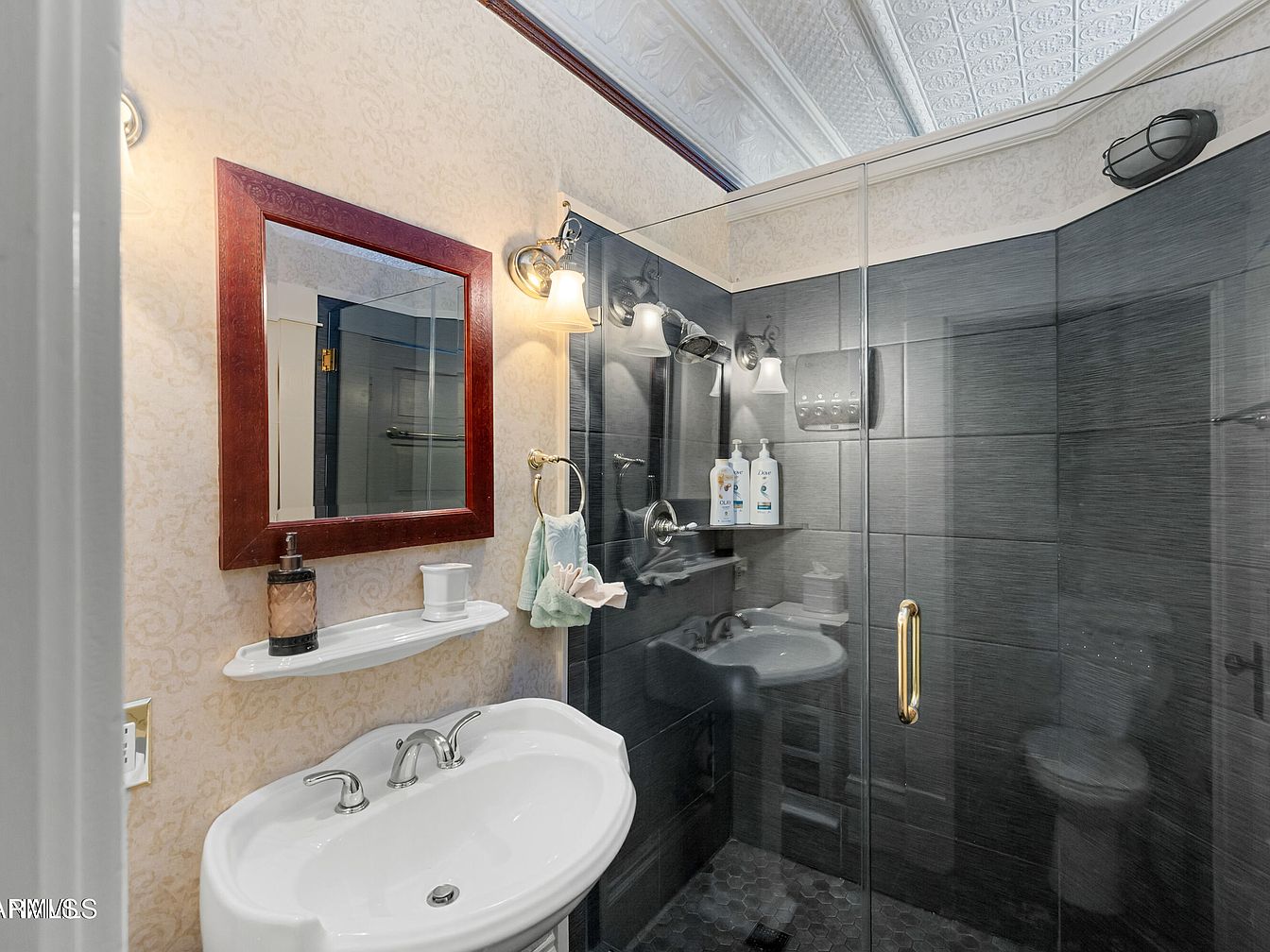 A compact bathroom features a blend of modern and classic design. The wall showcases textured wallpaper in a delicate pattern, contrasting with the sleek black tiles of a glass-enclosed shower area. A stylish white vanity with three chrome-finished taps provides functionality alongside aesthetics. Above the sink, a rectangular mirror framed in rich mahogany adds warmth and elegance. Soft lighting from two wall sconces illuminates the space, creating a serene ambiance. A wall-mounted shelf displays bathroom essentials, like soap and a cotton holder, keeping the area uncluttered. The overall color palette harmonizes neutral tones with striking black accents.