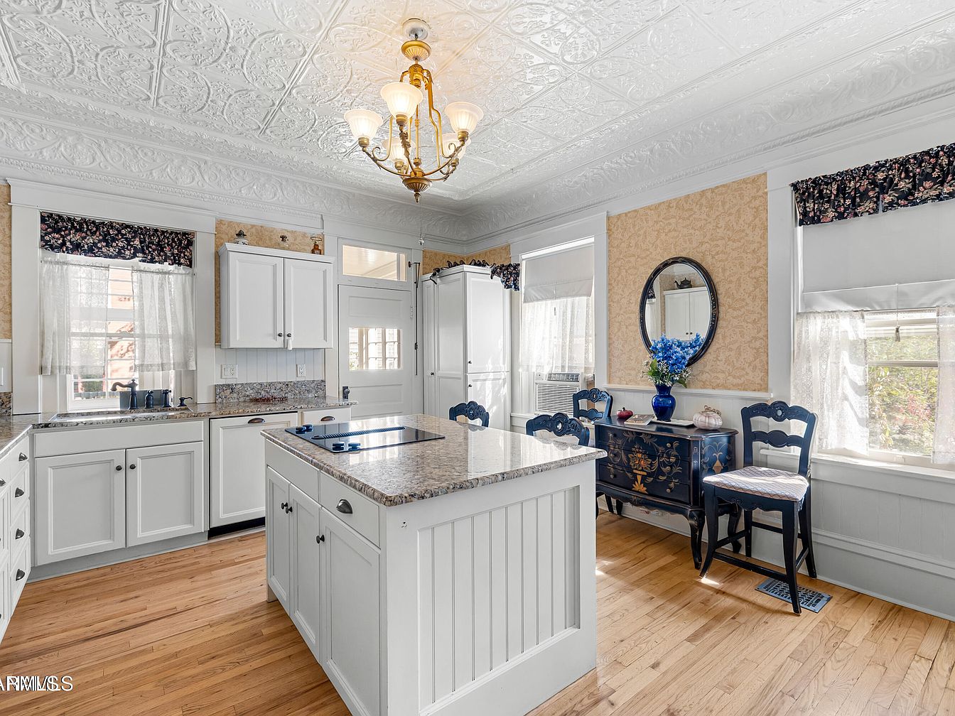 The kitchen features white cabinetry complemented by a rich, dark granite countertop, enhancing its bright aesthetic. A central island provides additional workspace and seating with elegant, dark wooden chairs. The ceiling showcases intricate white tin tiles, adding a vintage charm. Natural light floods the space through a large window adorned with a floral valance. Appliances are seamlessly integrated within the cabinetry, while traditional elements, like the chandelier, blend with modern functionality. A decorative sideboard against the wall holds blue vases filled with bright flowers, injecting color and warmth into the room, creating an inviting atmosphere.