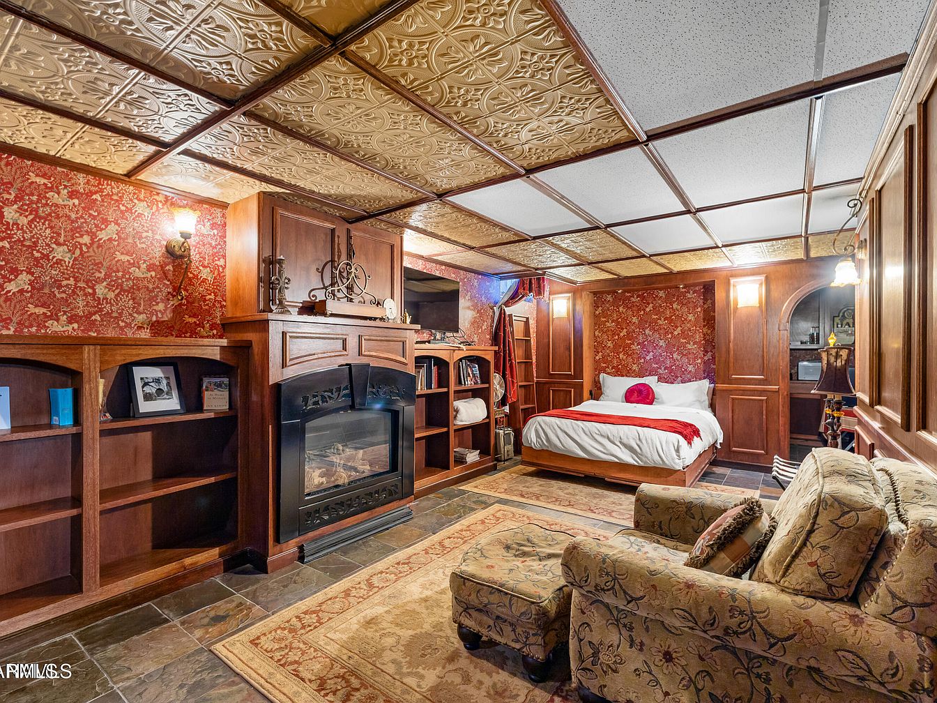 This space is an intimate bedroom featuring rich mahogany wood accents and intricate wallpaper with floral patterns. The layout includes a plush bed adorned with a red throw and a circular pillow. A stone fireplace, framed in dark wood, adds warmth and character, complemented by built-in bookshelves displaying framed photos. The ceiling showcases a decorative tin design, enhancing the room’s vintage charm. Soft lighting from wall sconces and a lamp provides a welcoming ambiance. An upholstered chair with floral fabric invites relaxation, while a cozy rug underfoot enhances the sense of comfort in this charming retreat.