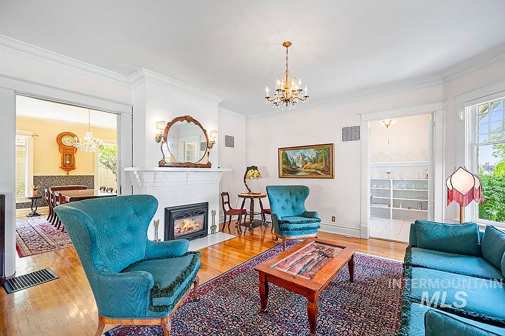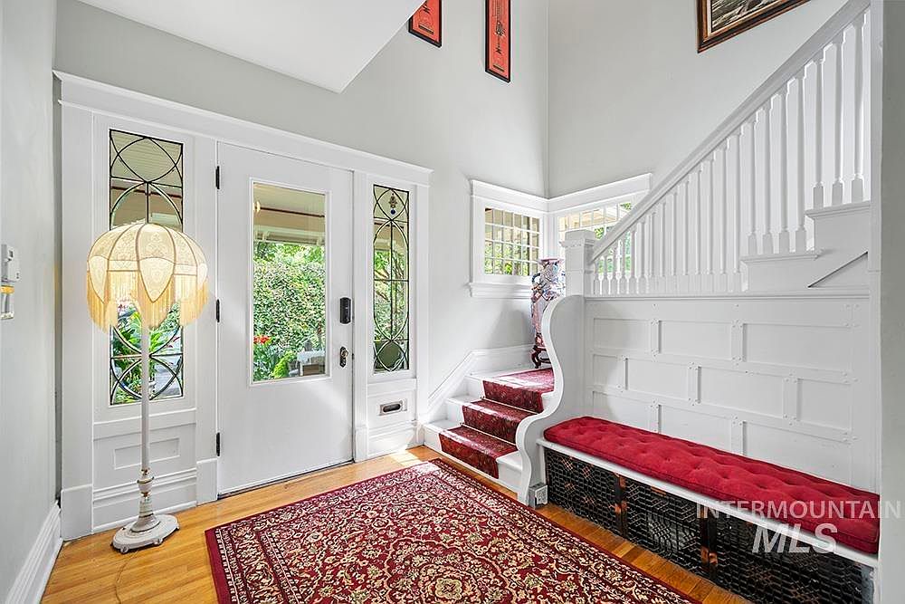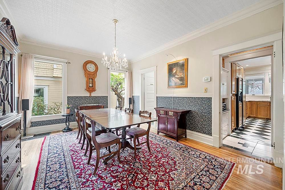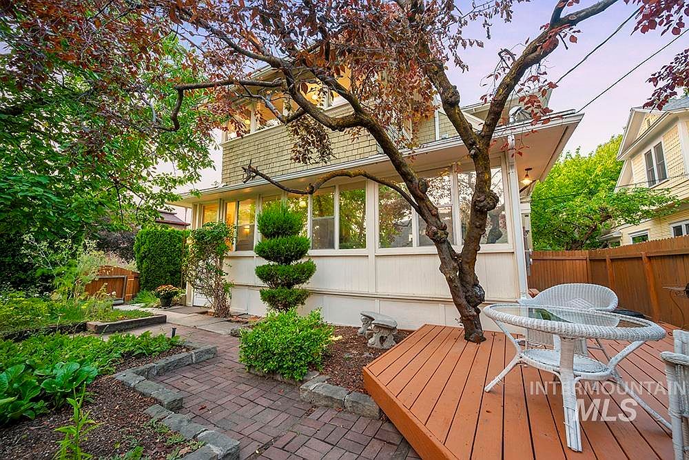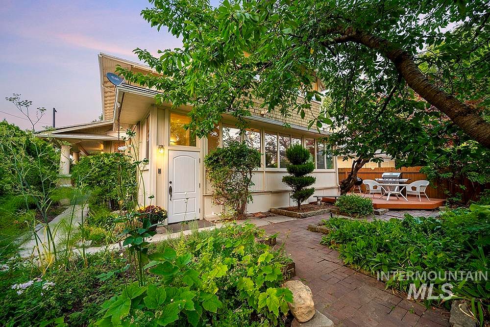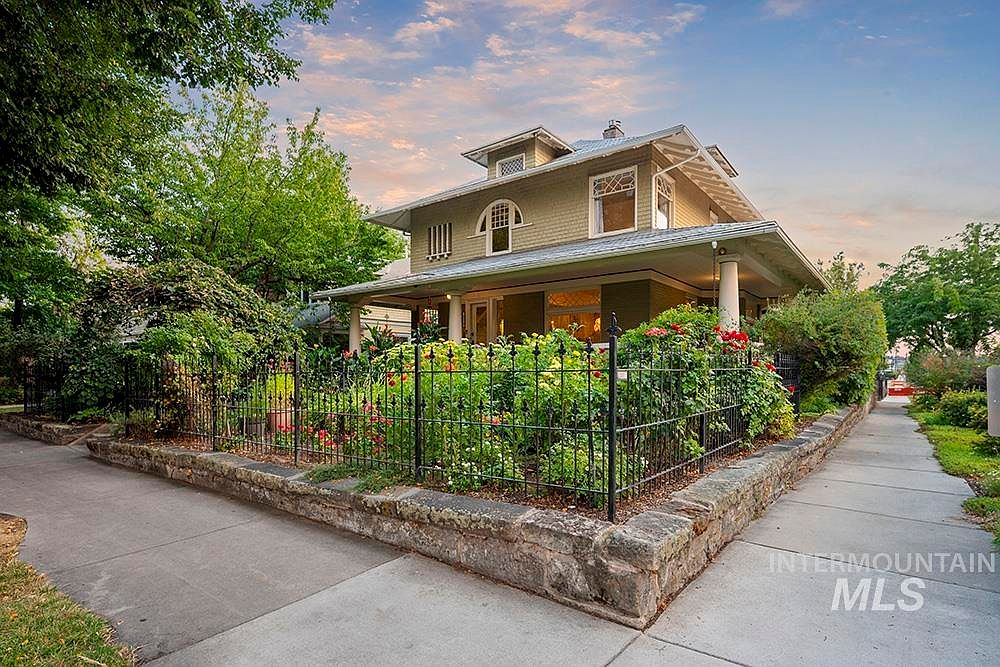 The Sensenig House, built in 1905, is an elegant Foursquare style home located in Boise, ID, perfectly positioned between downtown and the North End. Registered on the National Register of Historic Places, it has earned a Historic Preservation Award for its thoughtful renovations, which include modern amenities while preserving original features like leaded glass and hardwood floors. With a listing price of $1,198,000, this property sits on a generous corner lot, enhancing its curb appeal with lush gardens and a charming wraparound porch. Spanning 4 bedrooms and 2 baths, recent updates include radiant heat and EV-ready garage, making it a versatile live-work space ideal for both personal and commercial use.