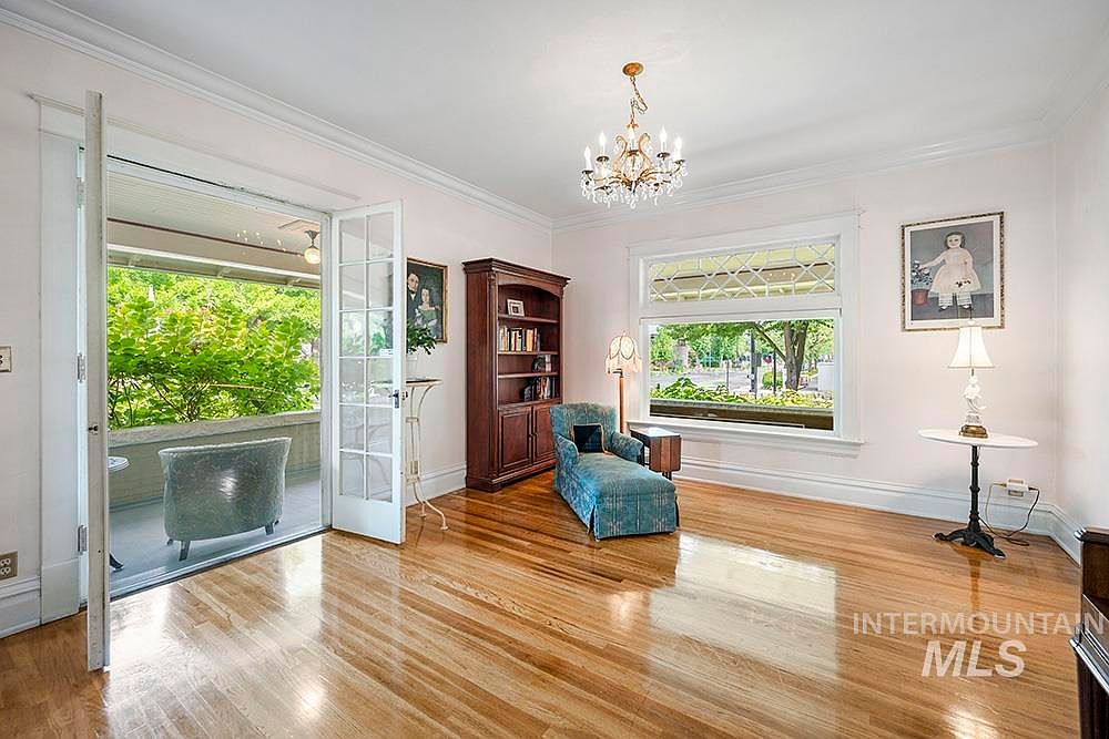 This living room blends classic charm with a cozy ambiance. The space features a polished hardwood floor that reflects natural light, enhancing the soft pastel pink walls. A plush blue chaise lounge sits nearby a wooden side table, inviting comfort. Large windows adorned with elegant trim offer views of greenery, while a decorative chandelier adds a touch of sophistication. A dark wooden bookshelf filled with books provides warmth, contrasting beautifully with the lighter color scheme. Two sets of double doors lead to a welcoming porch, creating a seamless indoor-outdoor connection, perfect for relaxation and entertaining.