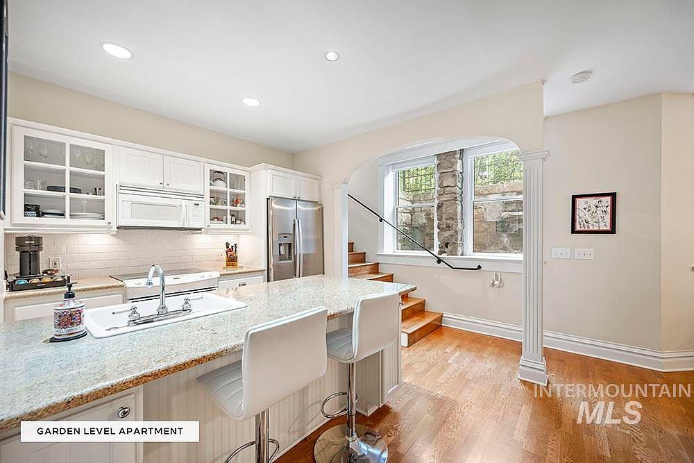This inviting kitchen showcases a modern yet cozy atmosphere. Optimally designed, it features a central island with a dark granite countertop, complemented by sleek, curved white bar stools. The cabinetry is classic white, enhancing brightness, and is accented with transparent glass elements. A stainless steel refrigerator pairs elegantly with matching appliances, ensuring a cohesive look. Above, recessed lighting illuminates the area, highlighting a whimsical artwork on the wall. The warm, golden wood flooring adds charm, leading up to a set of wooden stairs that connect to the upper level, seamlessly blending functionality with sophistication.