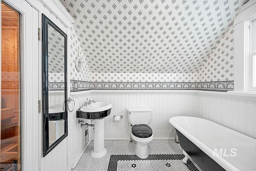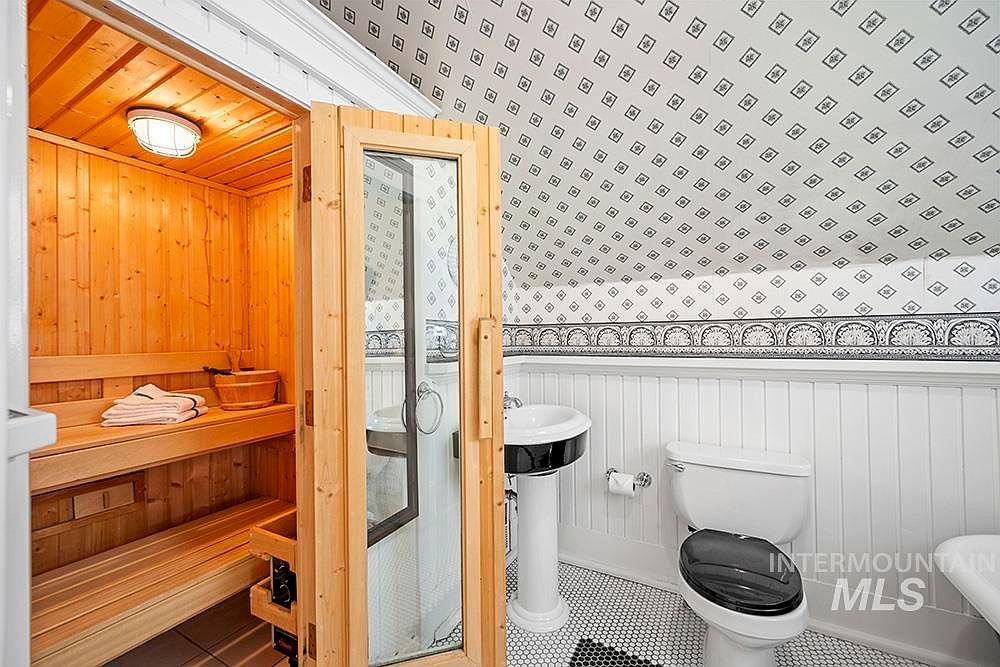 This space features a unique combination of a sauna and bathroom elements within a sloped ceiling. The warm wooden tones of the sauna contrast beautifully with the black and white elements throughout. The toilet and pedestal sink exhibit classic design, enhanced by a playful toilet seat. The walls are adorned with intricately patterned wallpaper, creating an elegant yet cozy atmosphere. Hexagonal tiles on the floor add texture, complementing the wood and traditional fixtures. A large glass door showcases the sauna, inviting relaxation while maintaining an open and light-filled environment, perfect for unwinding after a long day.