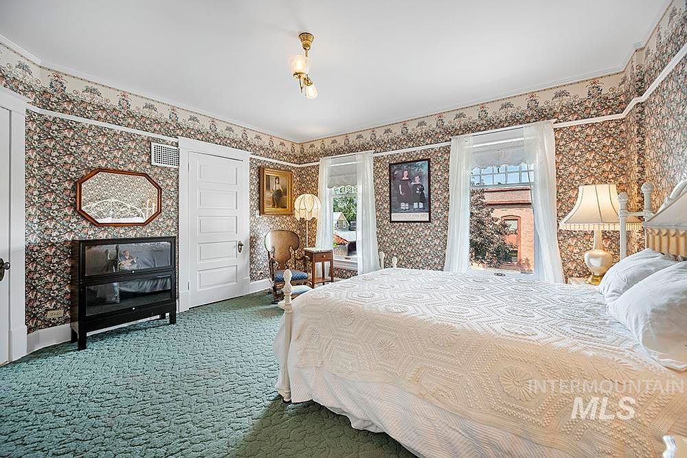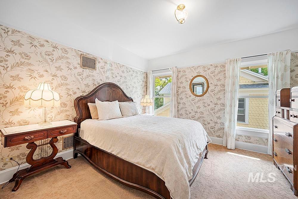 This inviting bedroom features a charming floral wallpaper that adds a vintage touch. A spacious bed with a textured white bedspread is the focal point, complemented by a subtle green carpet that enhances the cozy atmosphere. Natural light floods in through two large windows, adorned with sheer white curtains, revealing a glimpse of the outside greenery. An ornate, hexagonal mirror hangs on the wall, its deep frame contrasting beautifully with the floral backdrop. Nearby is a sleek black dresser, paired with a vintage-style lamp and an upholstered chair, creating a comfortable reading nook. Elegant design elements reflect a historic, yet homey ambience.