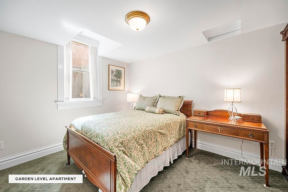 This garden-level bedroom features a cozy layout, ideal for relaxation. The bed, dressed in a light green patterned duvet, is complemented by matching pillows, creating a harmonious look. A wooden nightstand with an elegant lamp stands beside the bed, providing soft lighting. Natural light pours through the small window, framed with sheer white curtains, enhancing the airy feel. The walls are painted in a soft beige, contrasting with the rich, dark wood of the furniture. A textured green carpet adds warmth underfoot, while an artwork hangs above a desk, adding a touch of personality to the space.