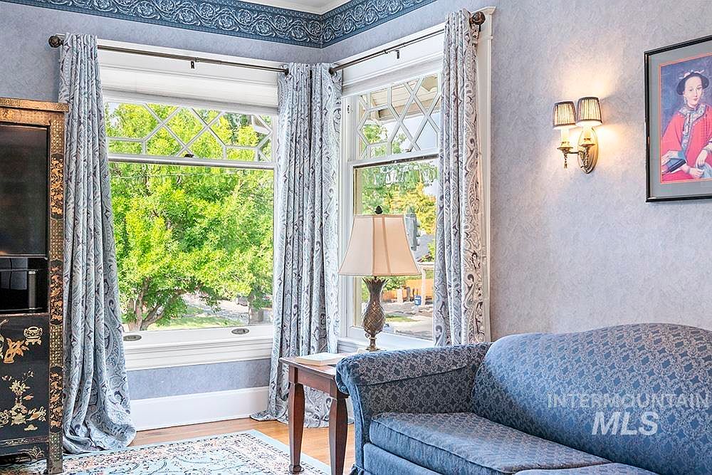 This sitting room features a cozy arrangement with a classic blue-patterned couch facing large bay windows. Rich, elegant drapes, matching the wall color, frame the windows, allowing warm natural light to enhance the space. A vintage-style lamp adds a soft glow, while the ornate wall sconces provide additional illumination. Architectural details include decorative trim along the ceiling and a subtle, textured wallpaper offering a sophisticated backdrop. A wooden side table complements the soft hues and holds the lamp, while a Persian-style rug underfoot adds a touch of warmth and texture, inviting comfort and relaxation.
