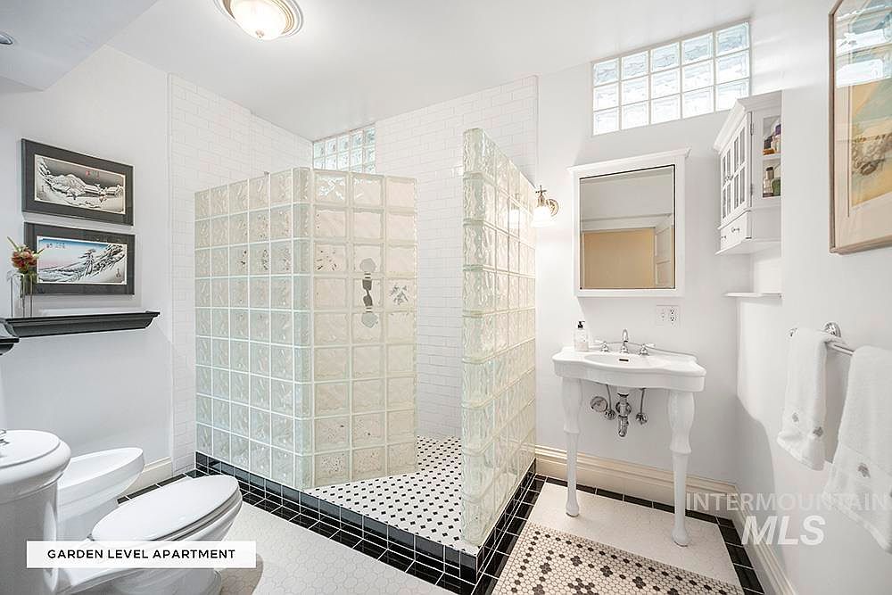 The bathroom features a unique layout, with a glass block shower partition providing an elegant separation from the rest of the space. White subway tiles accentuate the walls, creating a clean and modern aesthetic. Contrasting black and white hexagonal tiles are laid on the floor, adding visual interest. A small, vintage-style pedestal sink is positioned beneath a sleek mirror, complemented by modern light fixtures. Decorative artwork hangs on the walls, infusing character. The overall color scheme is crisp and bright, enhancing the natural light from the glass blocks, making the space feel open and inviting.