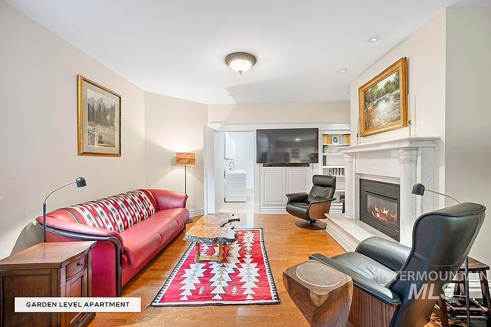 The space features a cozy living room with a striking red and white striped sofa, paired with two black leather armchairs. A vintage wooden coffee table sits atop a vibrant patterned rug, adding warmth. The soft beige walls and polished hardwood flooring create an inviting atmosphere. A stylish floor lamp provides illumination near the sofa, while artwork adorns the walls, adding character. A fireplace with a sleek marble mantle serves as a focal point, enhancing the room’s charm. Built-in shelves accommodate a television and books, offering both functionality and an element of modern design in this historic setting.