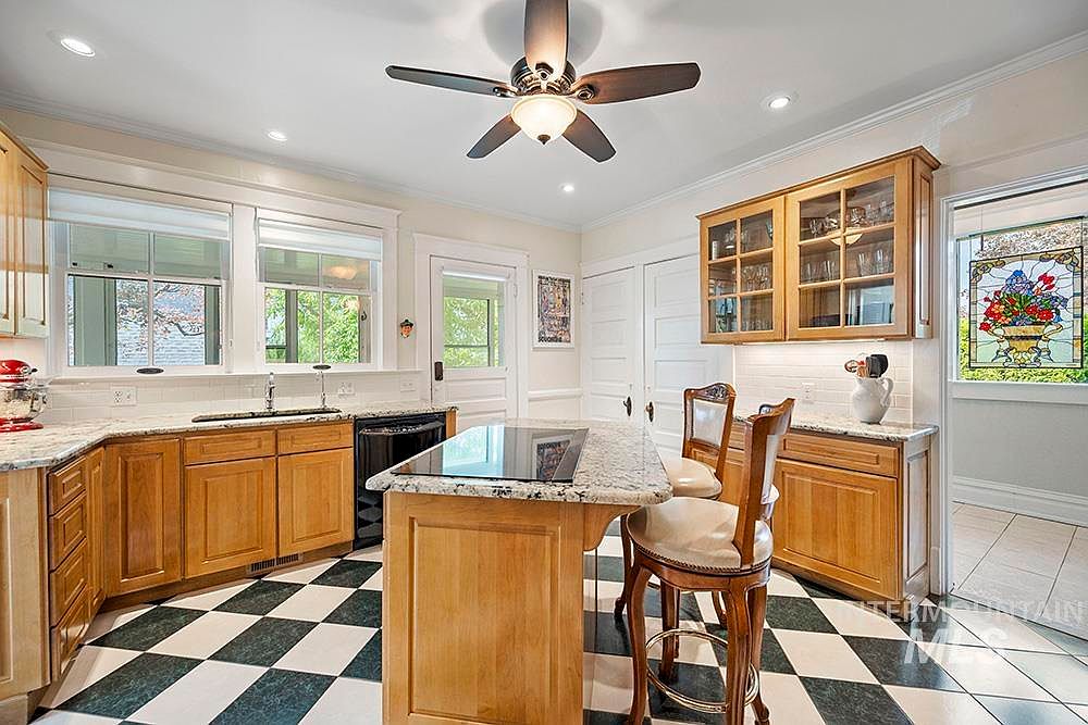 A modern kitchen combines functionality with aesthetic charm. The cabinetry features warm wood tones, complementing the elegant granite countertops. A central island invites casual dining, with bar stools offering a cozy seating area. Floor tiles alternate between black and white in a classic checkerboard design, enhancing the vintage feel. Large windows allow natural light to flood the space, showcasing rich textures and colors. Stained glass accents add artistic flair beside the door, while a stylish ceiling fan completes the inviting atmosphere. Sleek appliances, including a black stove, harmonize with the overall design, blending contemporary and historic elements.