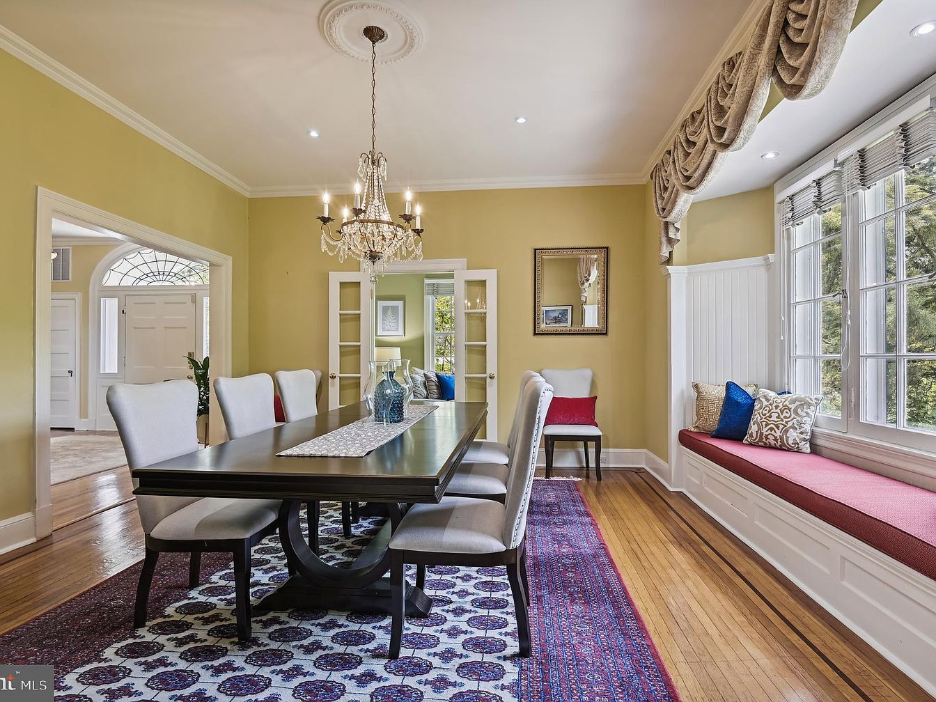 This sophisticated dining room features a large, dark wood table with elegant upholstered chairs, complemented by a tasteful Persian rug. The walls are painted a warm yellow, creating a welcoming ambiance, while intricate crown molding adds architectural interest. A stunning chandelier hangs from the ceiling, illuminating the space. Natural light streams through expansive windows, framed with soft drapes, enhancing the room’s brightness. A cozy built-in window seat adorned with colorful cushions invites relaxation. Display cabinets on the wall showcase decor, and a decorative mirror reflects light, enhancing the overall elegance of this inviting dining area.