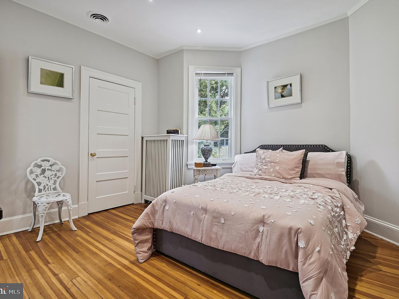 This cozy bedroom features a pastel color scheme dominated by soft pinks and warm whites. A plush bed adorned with a flowery blanket sits centrally, showcasing delicate floral motifs. To the side, a small white accent chair adds a touch of elegance. A vintage wooden radiator blends seamlessly with the space, while subtle framed artwork enhances the walls. A large window allows natural light to filter in, illuminating the polished hardwood floors, which add richness and warmth. The overall layout is inviting, balancing modern comfort with classic charm. Simple decor maintains an airy, serene atmosphere.