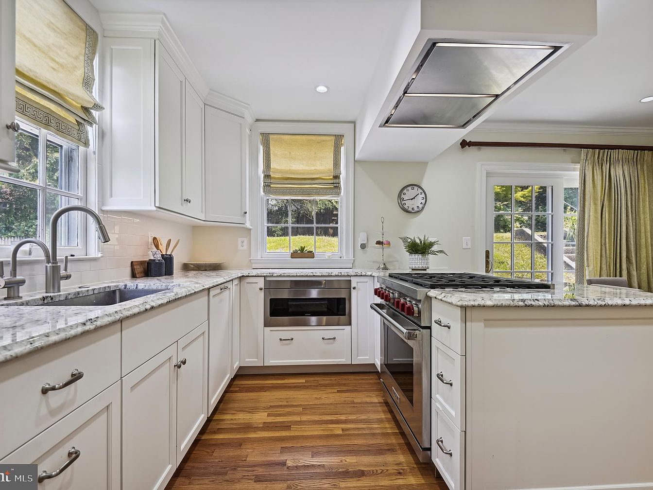 The kitchen features an L-shaped layout with white cabinetry and a striking granite countertop. Natural light floods the space through dual windows adorned with stylish Roman shades. A stainless steel stove stands prominently against the wall, complemented by a built-in oven and sleek dishwasher. The cabinetry showcases simple handles, emphasizing a blend of modern and classic aesthetics. The warm, honey-toned hardwood floor contrasts with the lighter color palette, enhancing the inviting atmosphere. A small decorative plant and kitchen utensils add personal touches, making the space feel functional yet relaxed, perfect for cooking and entertaining.