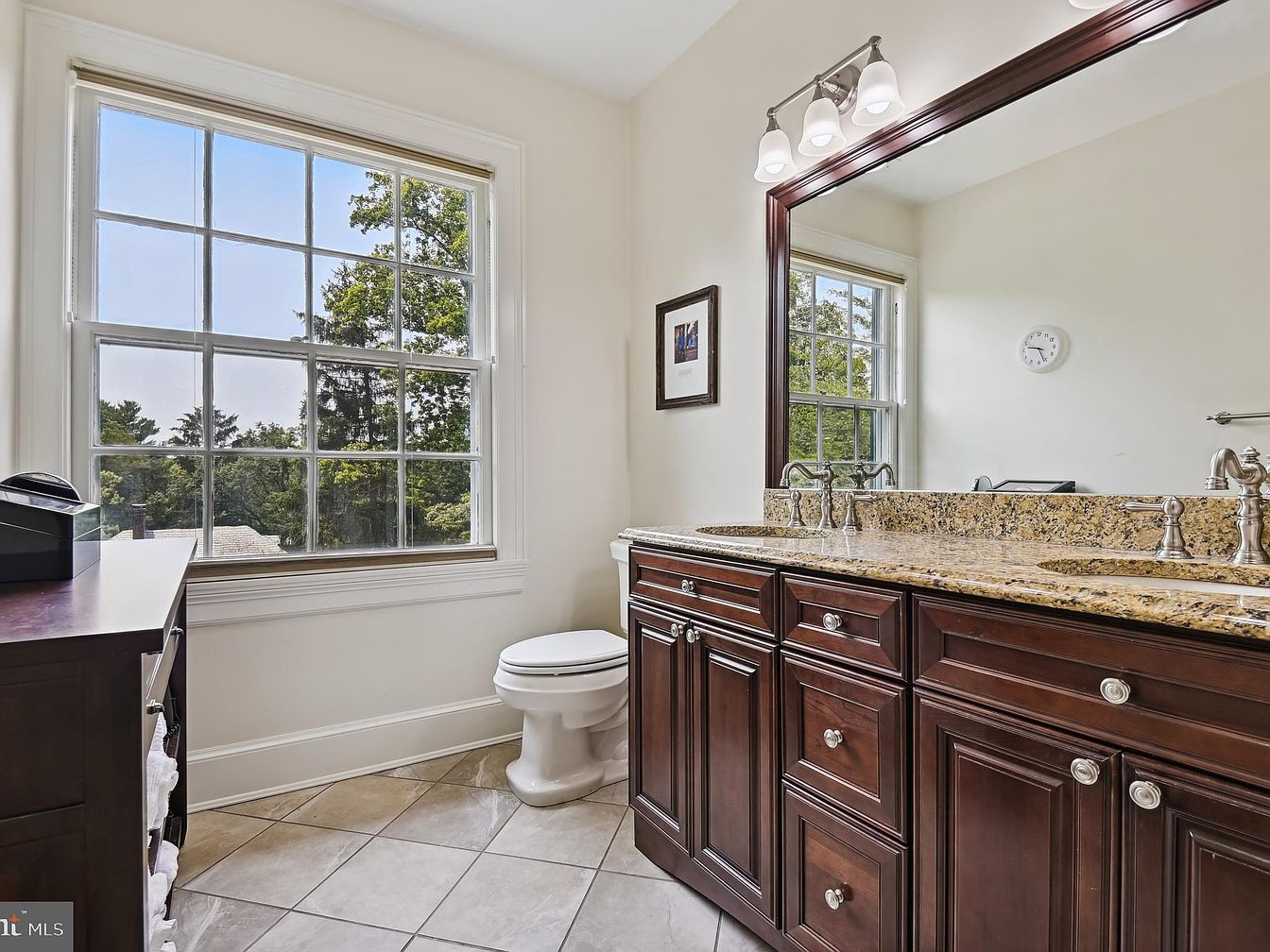 This bathroom features a rich, wooden vanity with a polished granite countertop, showcasing dual sinks. The dark cabinetry contrasts beautifully with the light beige walls, creating a warm and inviting atmosphere. A large window floods the space with natural light, framed by minimalist trim, and offers a view of lush greenery outside. The elegant chrome fixtures on the sinks and the overhead lighting add a modern touch. The floor is adorned with neutral-toned tiles, enhancing the overall sense of openness. A simple wall clock and framed artwork add personal touches, balancing functionality and aesthetics.
