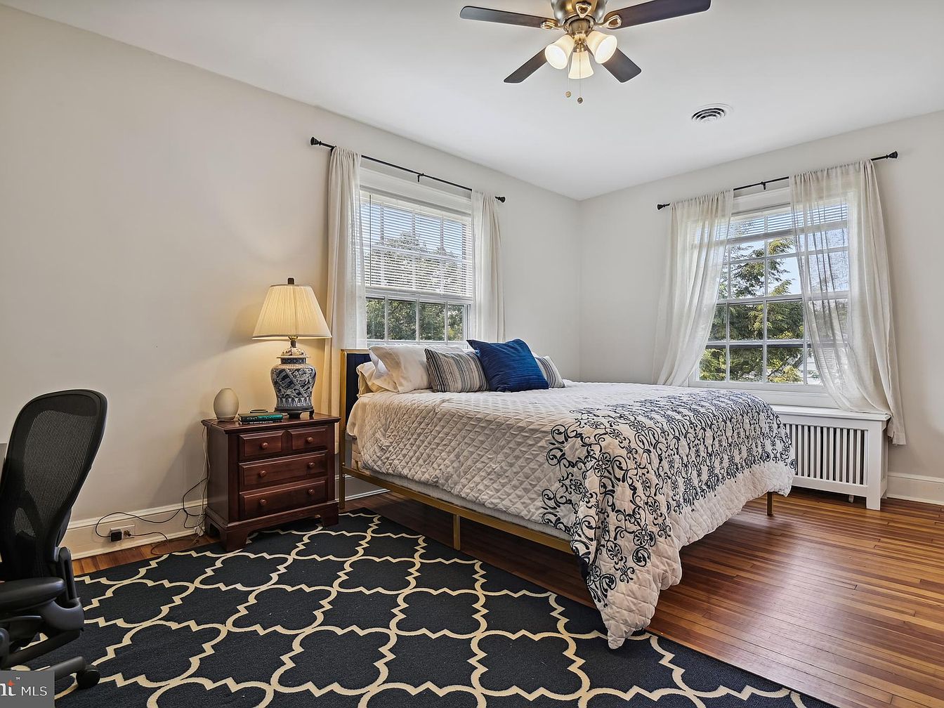 This bedroom showcases a serene layout centered around a queen-sized bed adorned with a patterned blue and white quilt. Two large windows allow natural light to flood in, framed by sheer white curtains, enhancing the airy feel. A vintage wooden nightstand stands beside the bed, topped with a ceramic lamp and a small decorative item. The floor features rich, warm hardwood, complemented by a dark area rug with a geometric white pattern. A cozy chair adds to the inviting atmosphere, while a sleek desk is discreetly positioned, making the space functional without compromising its tranquility.