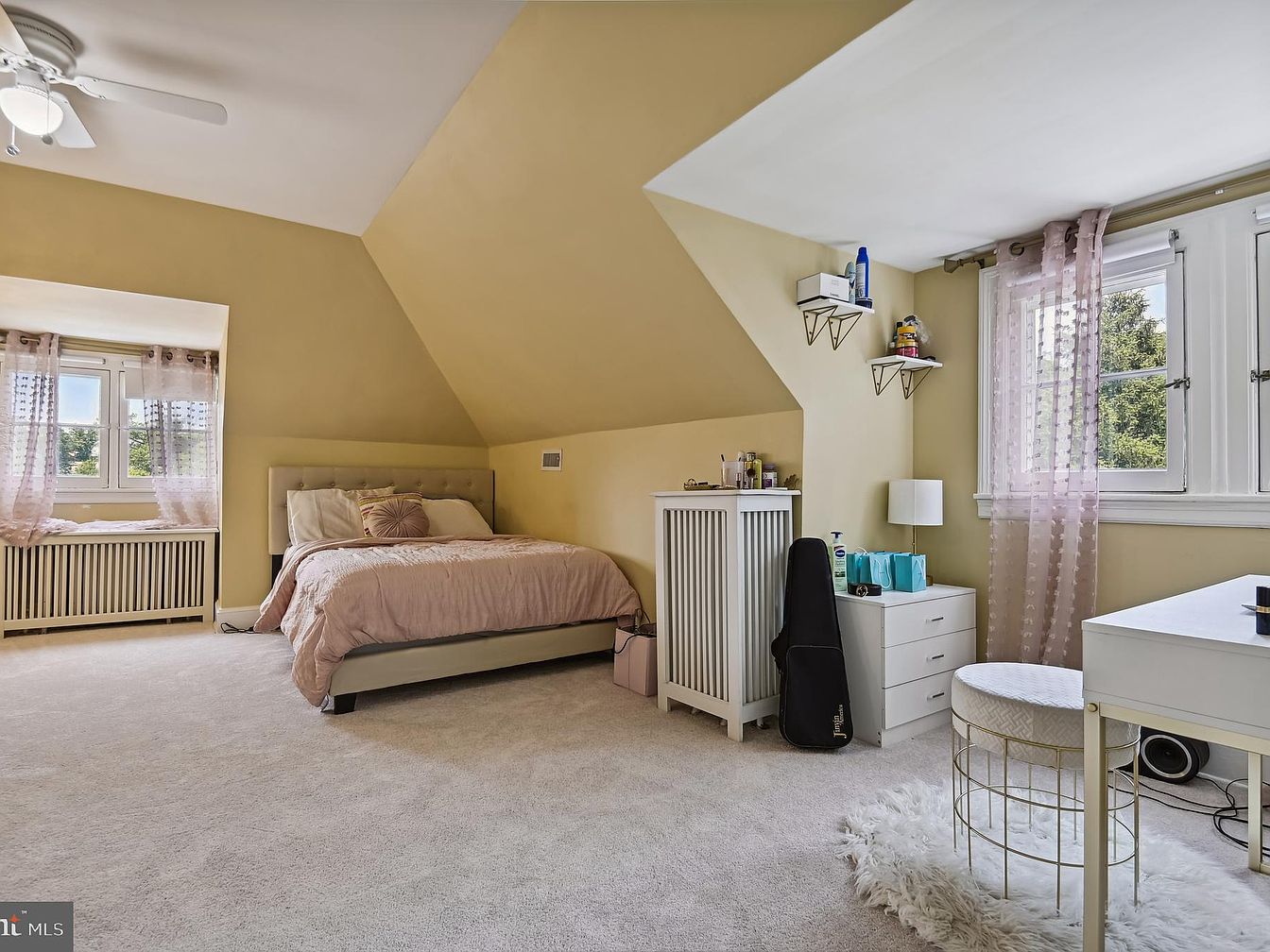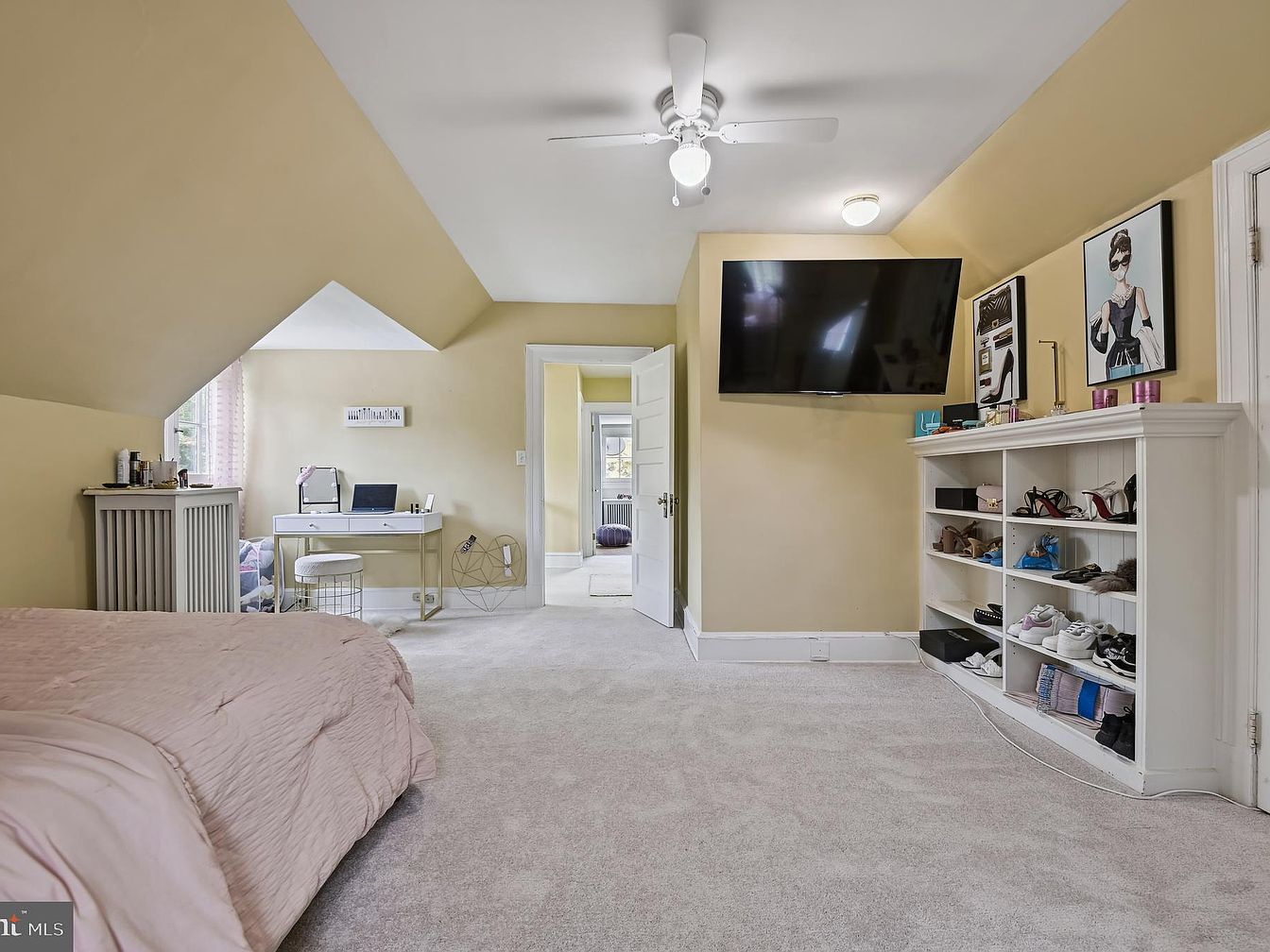 This cozy bedroom features a soft yellow color scheme, enhancing warmth and light. A plush, light-colored carpet covers the floor, while a stylish bed with a wrinkled pink coverlet occupies one corner. An angled ceiling introduces architectural interest. A large flat-screen TV mounted on the wall offers modern convenience, while adjacent frames showcase tasteful art. A sleek, white desk sits beside a radiator, paired with a minimalist chair, creating a functional workspace. The room includes a shelf displaying shoes and accessories, ensuring organization. Natural light pours in through the window, accentuating the inviting atmosphere and thoughtful design elements.