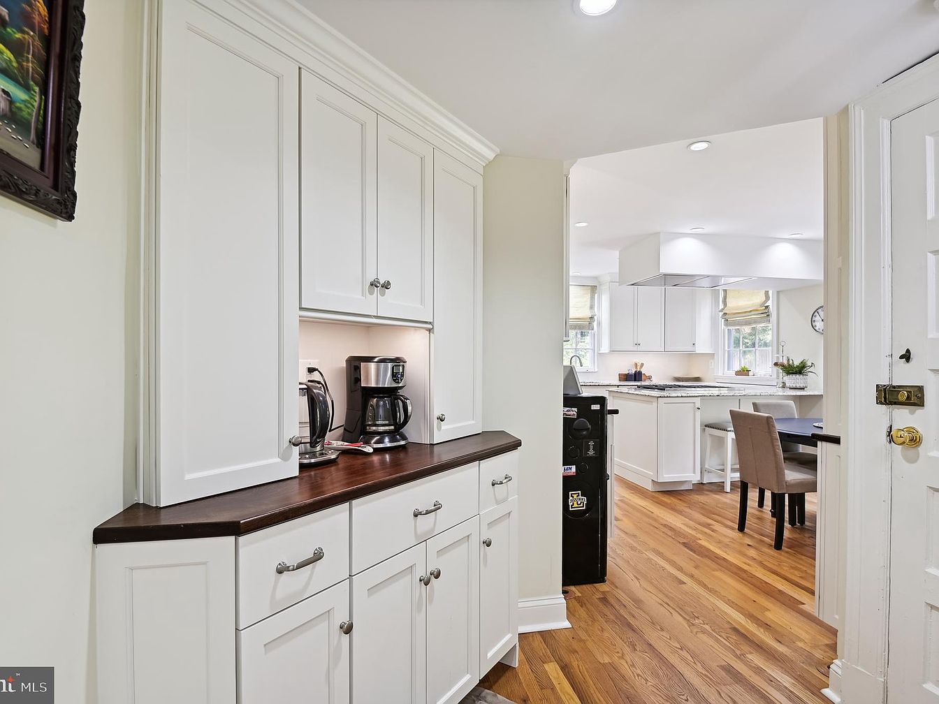 A transitional kitchen layout showcases a combination of modern and classic elements. The cabinetry features crisp white doors, while a dark wood countertop provides a striking contrast. A coffee station is neatly integrated into the cabinetry, displaying a coffee maker and kettle for convenience. Natural light floods the space, accentuated by warm, inviting tones of the hardwood flooring, enhancing the room’s overall warmth. Beyond, an open view reveals a dining area with simple gray chairs and a sleek table. Subtle decorative touches, such as a plant on the counter and framed artwork, add personality to this functional space.