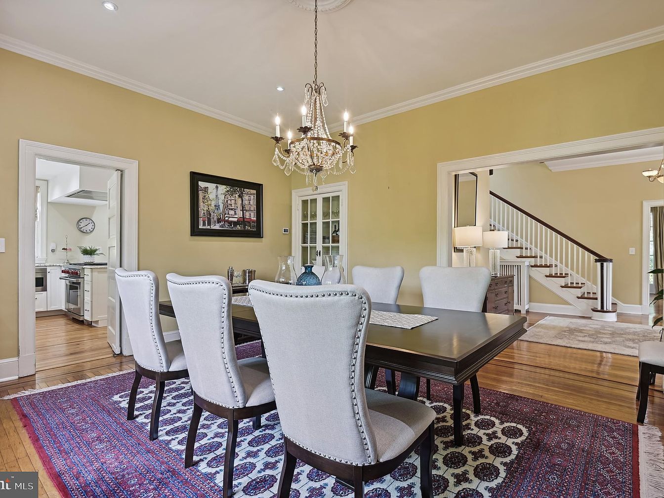 The dining room features a long, dark wooden table surrounded by plush, light gray upholstered chairs, exuding elegance. A beautiful chandelier hangs from the ceiling, providing warm illumination. The walls are painted a cheerful soft yellow, enhancing the inviting atmosphere. A patterned red and cream area rug anchors the space, complementing the hardwood flooring. To the left, a doorway leads to a modern kitchen, hinting at the home’s blend of traditional and contemporary styles. Decorative elements include a framed artwork depicting a street scene, adding character and charm. A staircase with a wooden banister is visible in the background.