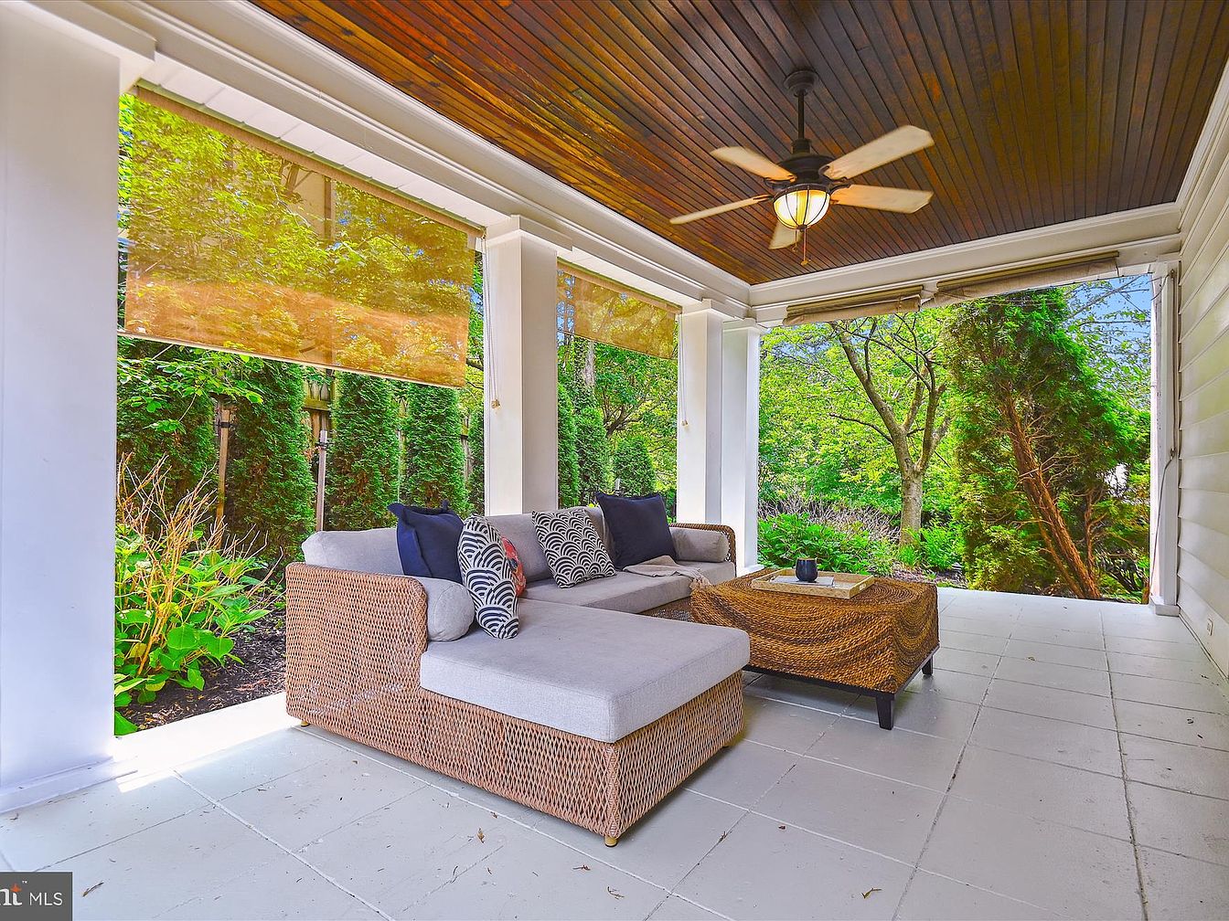 A cozy porch features a comfortable sectional sofa upholstered in light gray, adorned with black and white striped and solid navy cushions. A textured woven coffee table complements the sofa, adding warmth. Above, a ceiling fan with a vintage-style light illuminates the space, while decorative shades filter sunlight. The inviting atmosphere is enhanced by green foliage visible through large open windows that invite the outdoors in. The floor is finished with large white tiles, offering a clean, bright contrast to the natural elements surrounding the area. Lush plants and trees create a serene backdrop, enhancing the tranquility.