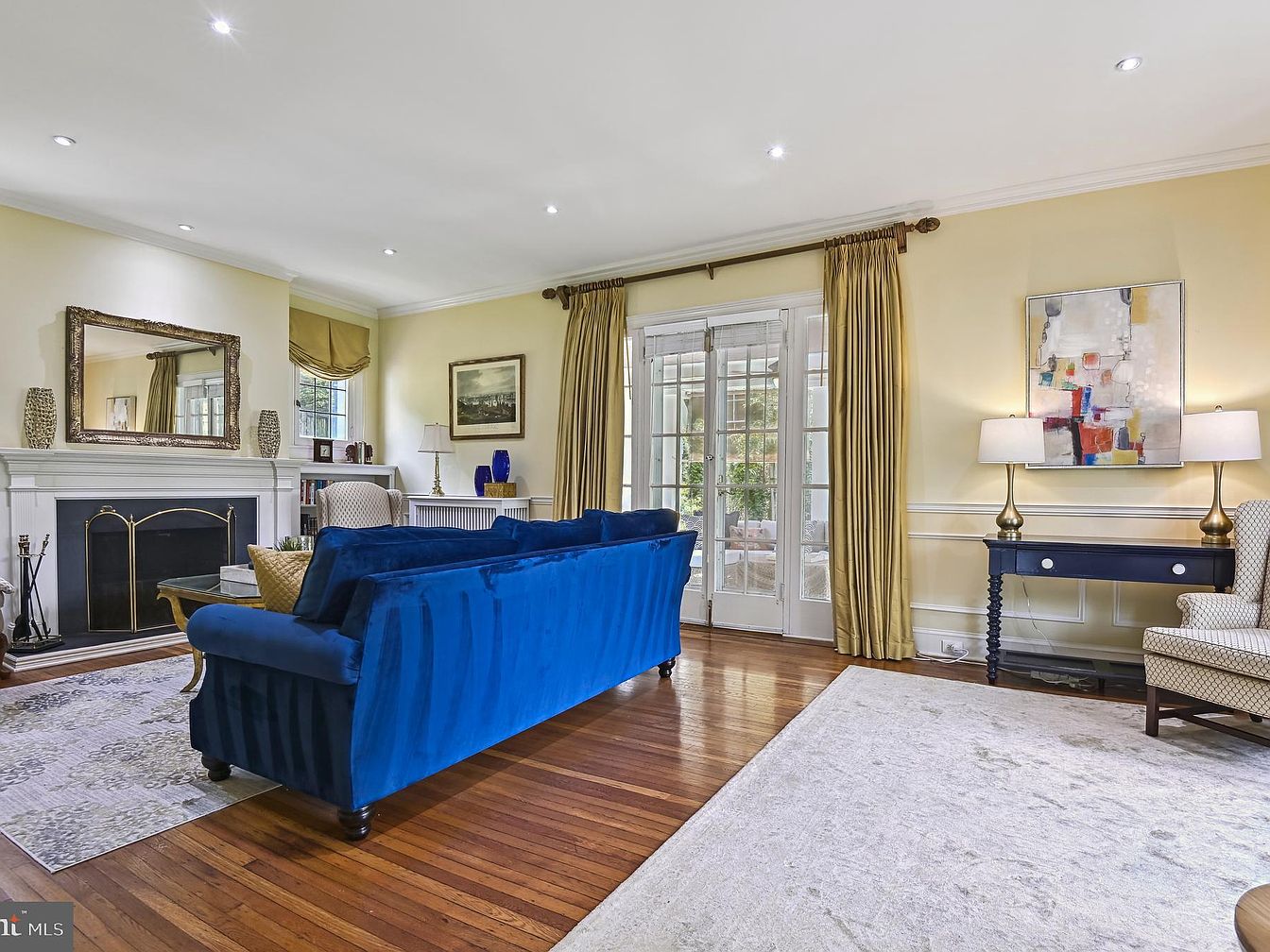 This spacious living room features a striking blue velvet sofa that anchors the space, complemented by warm hardwood flooring. The walls are painted a soft yellow, enhancing the airy feel. Natural light pours in through French doors, adding to the inviting atmosphere. Decorative elements include an ornate mirror above the fireplace, flanked by tall windows adorned with elegant drapes. A small, dark-wood console table holds a lamp, while a patterned armchair offers additional seating. A neutral area rug with intricate designs provides balance, tying together the eclectic mix of contemporary and traditional furnishings.