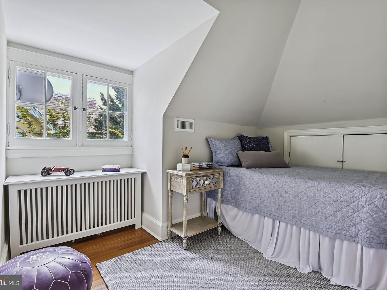 This attic bedroom features a sloped ceiling, accented by large windows that invite natural light and offer views of the greenery outside. The color palette consists of soft grays and whites, creating a calming atmosphere. A neatly made bed in gray tones is adorned with decorative pillows, complemented by a small accent table with an intricate design. A white radiator adds character while efficiently utilizing space underneath the window. A patterned area rug lies beneath, enhancing comfort. A playful purple pouf adds a touch of whimsy, making the room feel inviting and snug, perfect for relaxation.