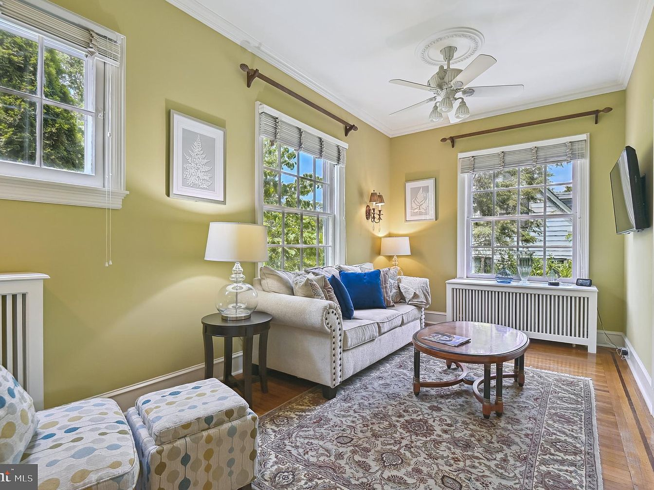 This cozy living room features a warm, light green color scheme that brings a refreshing vibe. The space is enhanced by large windows adorned with sheer blinds, allowing natural light to illuminate the room and offering views of lush foliage outside. A plush, cream-colored sofa is accented with patterned throw pillows in shades of blue, adding a pop of color. A small, round wooden coffee table sits atop an elegant area rug with intricate patterns. A modern ceiling fan complements the traditional architectural details, such as crown molding and decorative wall sconces, providing both comfort and style.