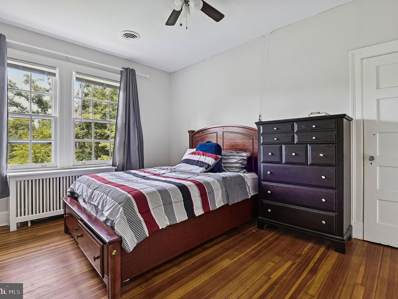 This bedroom features a warm and inviting atmosphere complemented by natural light coming through two large double-hung windows. The walls are painted a soft white, enhancing the brightness of the space. A cozy bed with a wooden headboard is adorned with a striped blanket in shades of red, navy, and gray, contrasting with the crisp white linens. Beside the bed stands a tall, dark wood dresser with silver knobs, adding elegance to the room. Rich hardwood flooring runs throughout, contributing warmth, while gray curtains frame the windows, adding a touch of sophistication to this restful retreat.