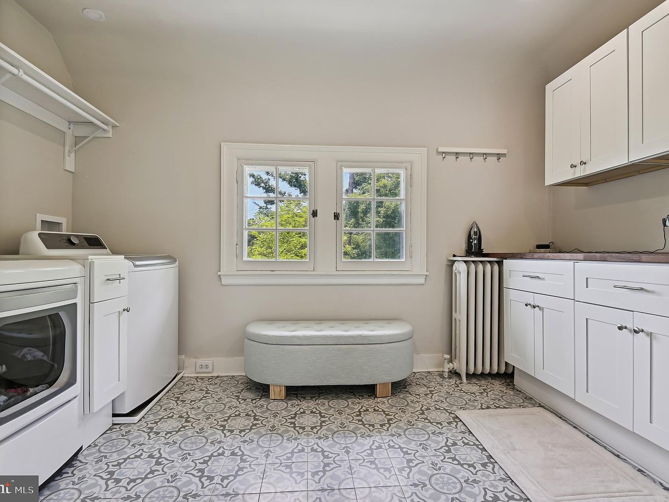 This laundry room features a blend of functionality and simplicity. Light beige walls create a warm atmosphere, while a patterned gray and white tile floor adds visual interest. To the left, a stacked washer and dryer are integrated discreetly with white cabinetry for organized storage. A small, cushioned bench in soft aqua serves as extra seating or a place for laundry tasks. Natural light streams through a large, multi-pane window, showcasing green foliage outside, enhancing the cheerful vibe. Above the countertop, a simple shelf offers additional storage, and a vintage radiator provides a cozy architectural touch.