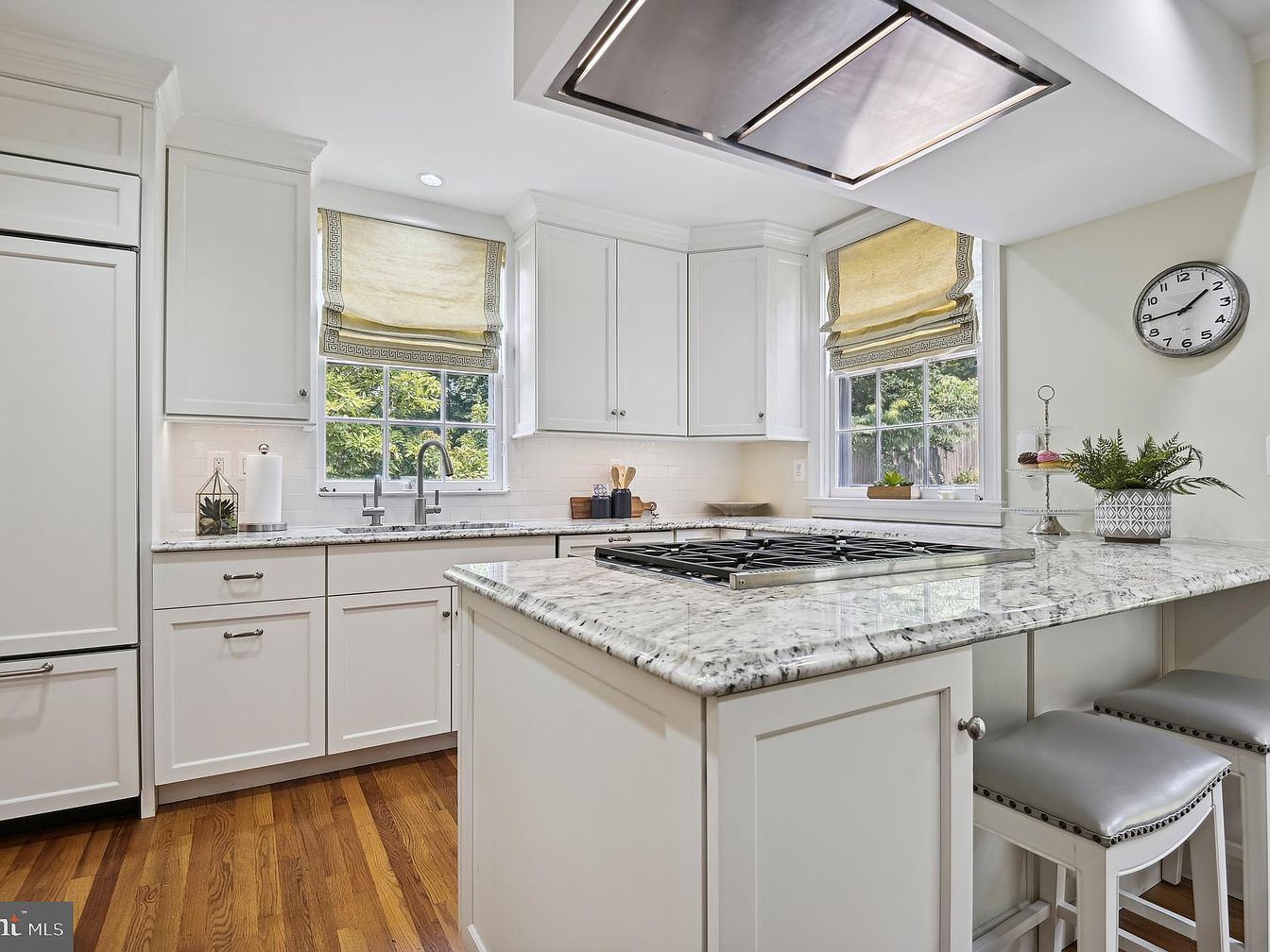 The kitchen features a bright, airy layout with white cabinetry and a chic marble countertop that enhances its spacious feel. Natural light floods through two windows adorned with soft, patterned shades, adding warmth to the neutral tones. A contemporary stainless steel range hood is positioned above a modern gas stove, integrating functionality with style. The wooden floor contrasts beautifully with the lighter elements, while bar stools with silver upholstery provide comfortable seating at the counter. Decorative elements, including a small indoor plant and stylish clock, add character, making the space inviting and ideal for cooking and gathering.