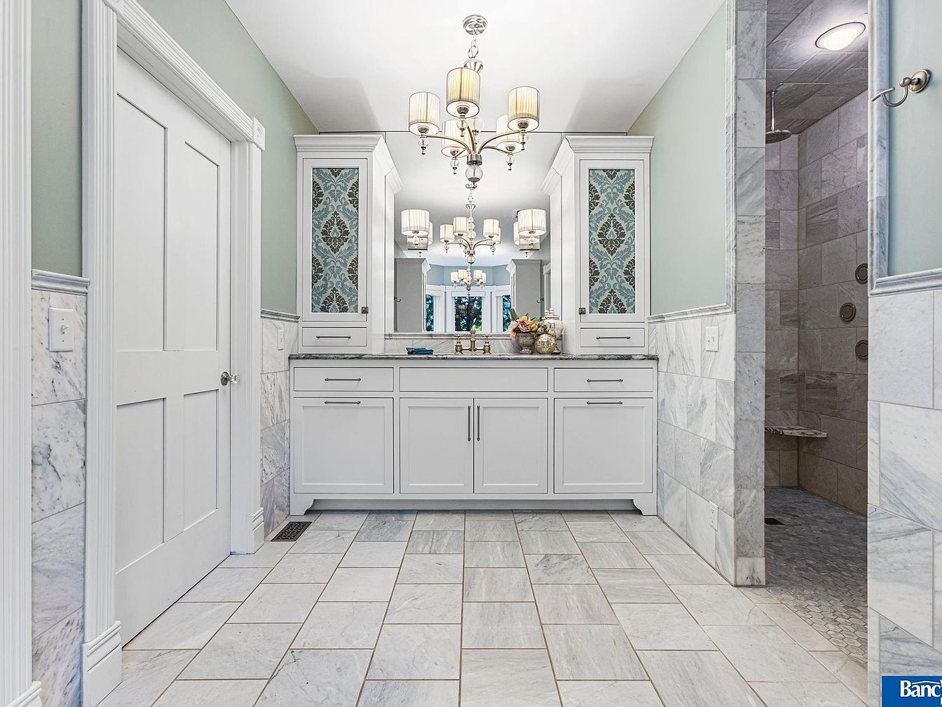A contemporary bathroom is showcased with a spacious layout. The walls are painted a soft green, complementing the elegant white cabinetry and marble tiles. A large, dual-sink vanity is centrally placed, featuring a polished countertop adorned with stylish fixtures and decorative elements. Flanking mirrors enhance depth and brightness, each accented with intricate blue-patterned designs. The floor boasts large marble tiles, arranged in a chic grid pattern, leading to a luxurious shower area. The shower, partially enclosed with glass, displays subtle mosaic tiles, adding sophistication. A modern chandelier overhead illuminates the room, creating a warm and inviting atmosphere.