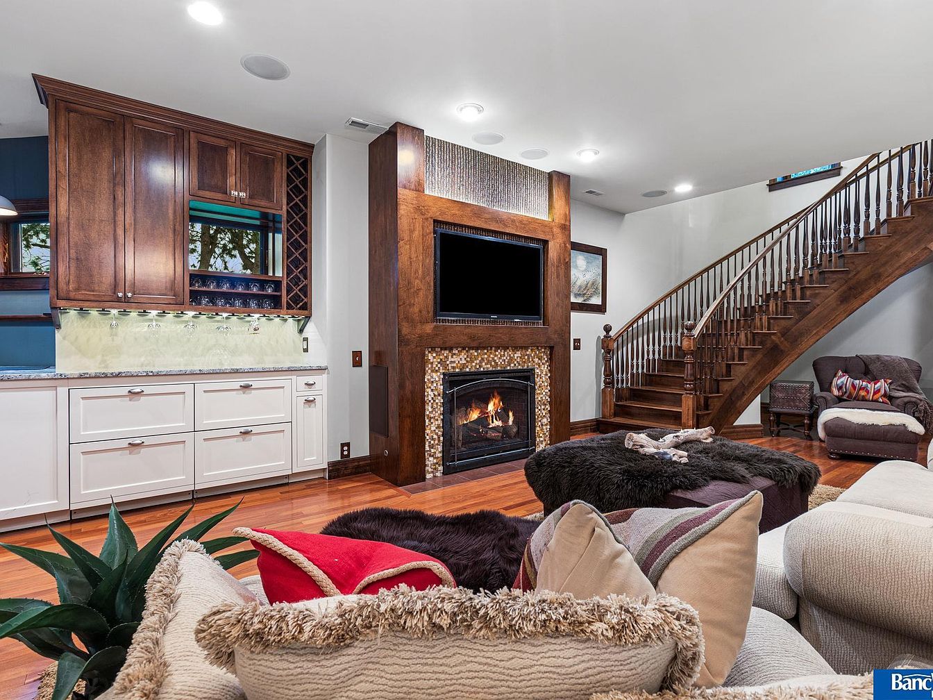 A warm and inviting living room featuring an elegant wooden staircase that curves gracefully to the upper level. The focal point is a cozy stone fireplace with a flat-screen TV mounted above it, creating a modern yet rustic ambiance. Rich wooden cabinetry with a wine rack complements a granite countertop, enhancing the room’s sophistication. Soft, textured furnishings, including plush sofas adorned with vivid throw pillows and a fuzzy ottoman, add comfort. A large plant introduces a touch of greenery, while the hardwood floors reflect the room’s warmth, creating a perfect blend of style and relaxation.