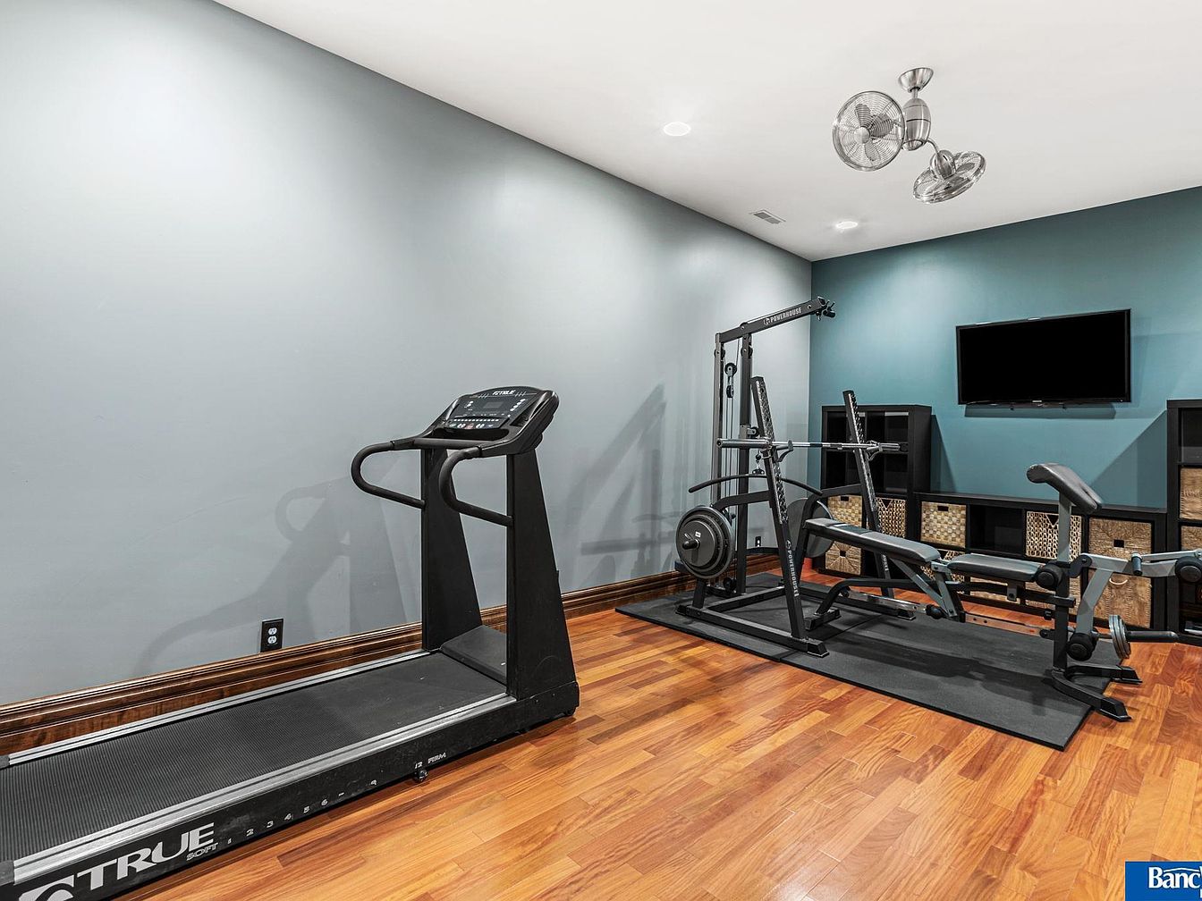 This home gym features a blend of functionality and style. The walls are painted in a calming light gray, enhancing the spaciousness of the room. A sleek black treadmill stands prominently on the left side, while a multi-functional weight bench with a squat rack occupies the right. The flooring is a warm, polished wood, adding elegance to the space. Above, modern dual ceiling fans provide ample ventilation. A flat-screen TV is mounted on the wall opposite the equipment, ideal for entertainment during workouts. Black shelving units with wicker baskets offer storage, maintaining an organized aesthetic.