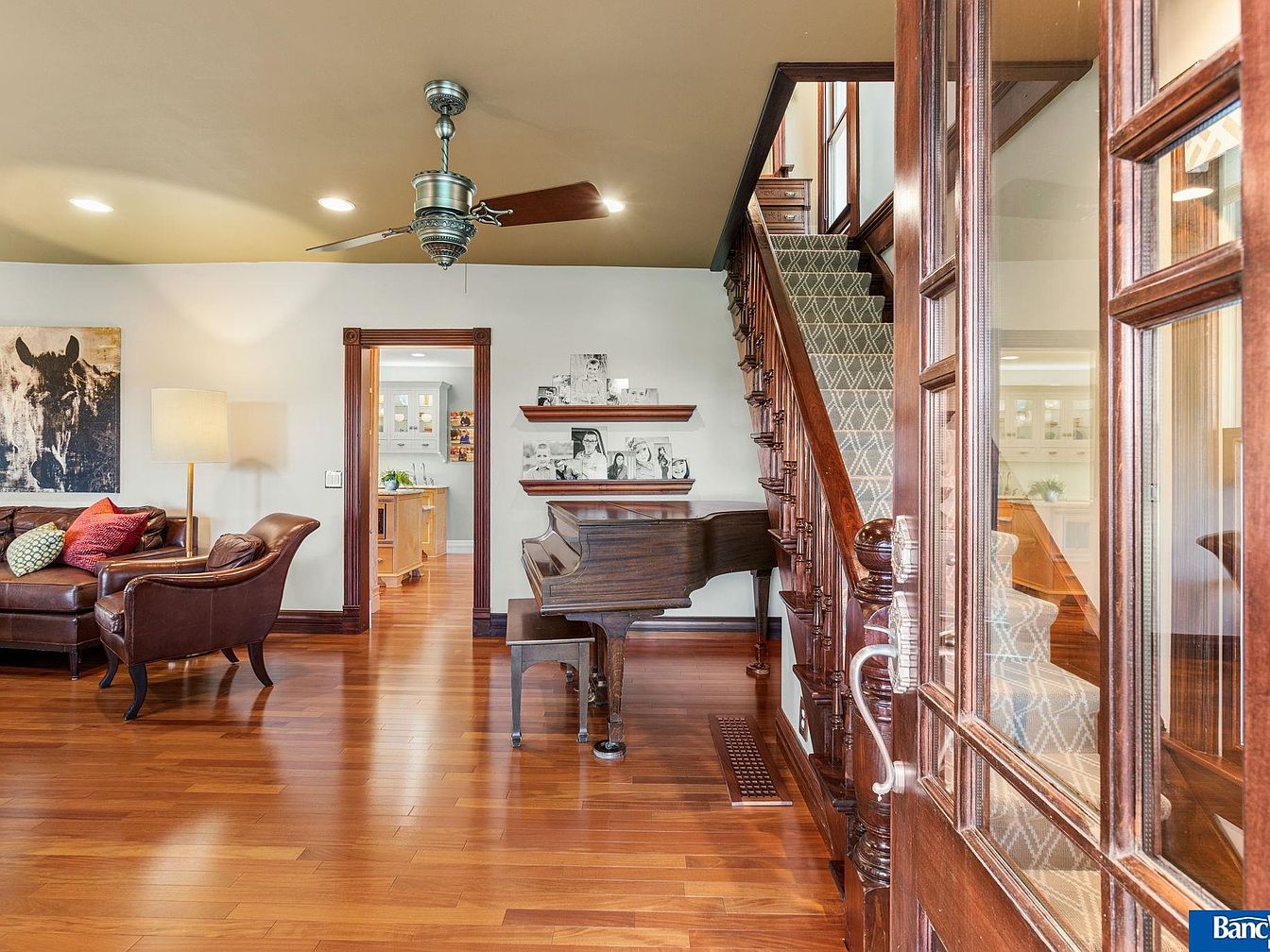 The entryway features rich wooden accents and an inviting layout. A dark hardwood floor complements the warm tones throughout. To the left, a plush brown leather chair is accompanied by an assortment of colorful pillows, adding comfort and style. A modern floor lamp subtly brightens the area. In the center, a grand piano enhances the artistic ambiance, flanked by floating shelves displaying framed photos. A sophisticated staircase with a patterned carpet leads upward, inviting exploration. A doorway in the back hints at the kitchen area, seamlessly blending functionality with the elegant design of this historic home.