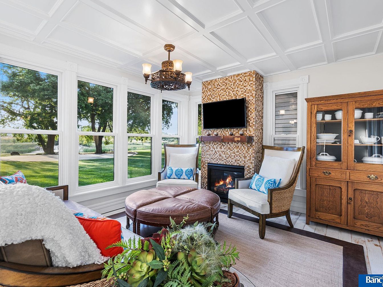 A cozy sunroom, featuring large windows that fill the space with natural light and offer a view of lush greenery. The ceiling displays an elegant coffered design, enhancing the room’s sophistication. A striking chandelier adds a warm ambiance, while a modern tiled fireplace serves as a focal point. Seating includes a circular ottoman in rich brown leather, complemented by two stylish armchairs adorned with blue throw pillows. An antique wooden cabinet houses tasteful china, merging classic and contemporary aesthetics. The overall color scheme blends earth tones with vibrant accents, creating an inviting and tranquil atmosphere.