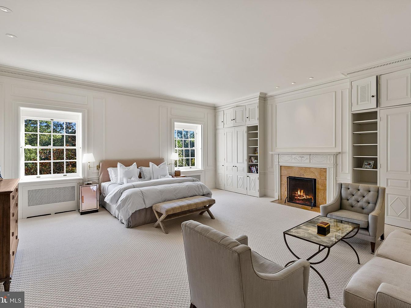 This elegant bedroom features a calming layout with a plush, neutral color scheme. A king-sized bed is adorned with soft gray bedding and numerous decorative pillows, creating a cozy centerpiece. On either side, large windows allow for abundant natural light, enhancing the airy feel. Light hardwood flooring is complemented by a soft, cream rug. A striking marble fireplace offers warmth and luxury, while built-in cabinetry and bookshelves provide functional storage. Two stylish armchairs paired with a sleek glass coffee table add an intimate seating area, suggesting relaxation and comfort in this refined space.