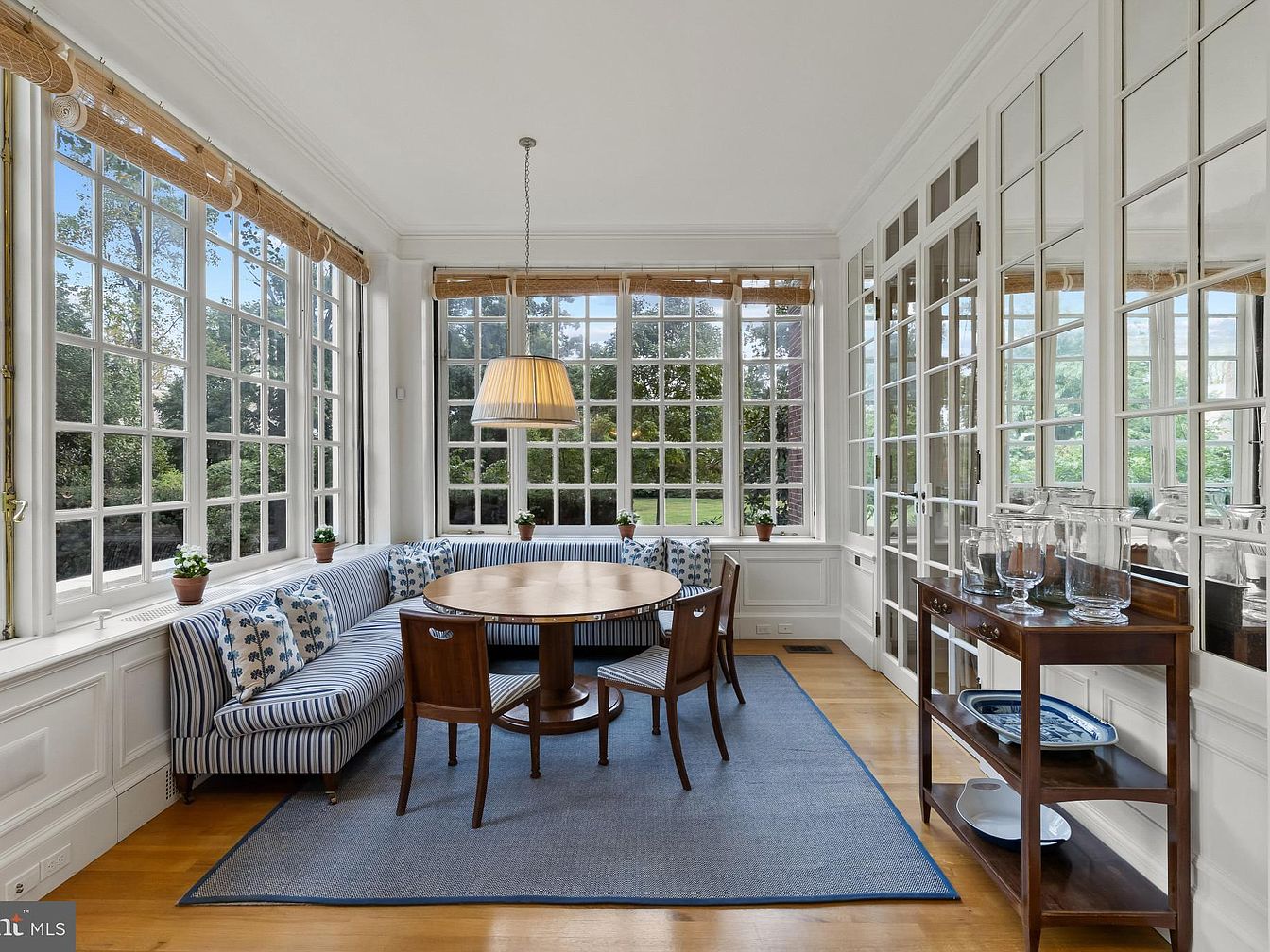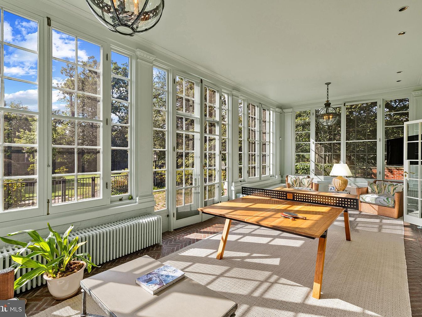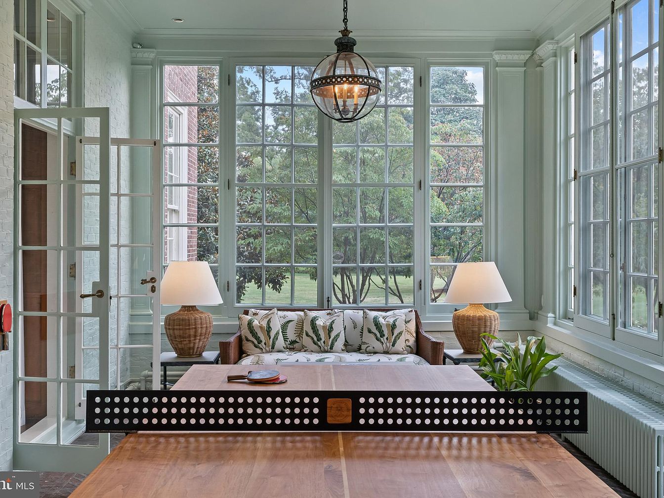 This sunroom features an abundance of large windows that invite natural light, creating a bright and airy atmosphere. The walls are painted in a soft, subtle hue, complementing the elegant trim and molding. Furnishings include a sleek wooden table at the center, supported by angular legs, paired with a cozy seating area comprising two patterned armchairs and a small side table. A stylish light fixture hangs from the ceiling, adding a touch of sophistication. The room’s floor is adorned with a textured area rug, while a lovely houseplant sits near the vintage-style radiator, enhancing the inviting aesthetic.