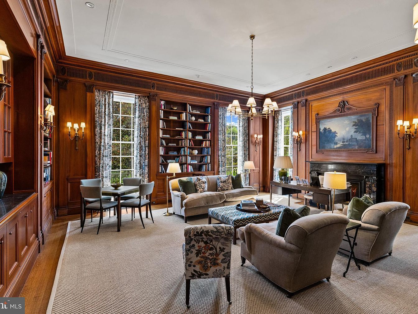 A luxurious living room featuring rich wooden paneling and an elegant ambiance. The space is anchored by plush seating, including a comfortable sectional and two armchairs with floral upholstery. A patterned coffee table stands at the center, surrounded by a soft, textured rug that complements the warm wood tones. Large windows, adorned with patterned drapes, flood the room with natural light, while sconces and a chandelier provide a warm glow. A classic fireplace adds charm, framed by an ornate painting and finished bookshelves, completing the sophisticated aesthetic of this inviting space.