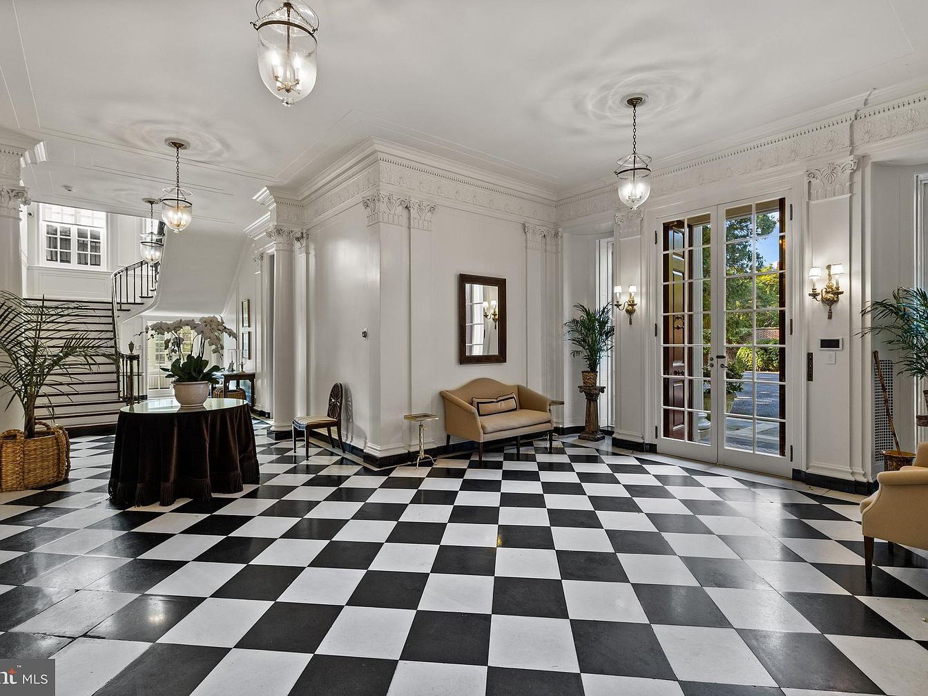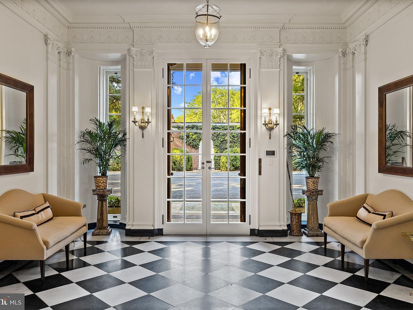 The entryway features a classic design with a striking black-and-white checkered floor. Two elegant sofas with soft beige upholstery and contrasting cushions flank the sides, inviting comfort. Tall potted greenery adds a touch of life, complemented by intricately detailed wall moldings and a crystal chandelier overhead, enhancing the room’s grandeur. Large French doors provide a view of the outdoors, allowing natural light to flood the space. Decorative wall sconces illuminate the area, while mirrors amplify the light and space, creating a welcoming ambiance that seamlessly blends historical details with modern comfort.